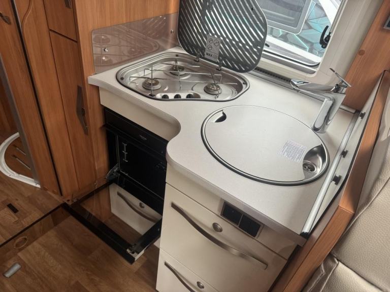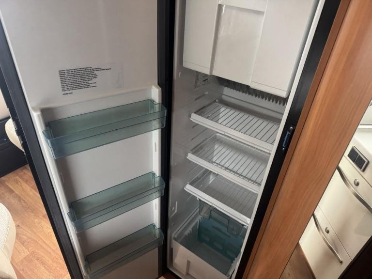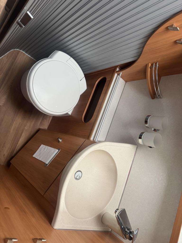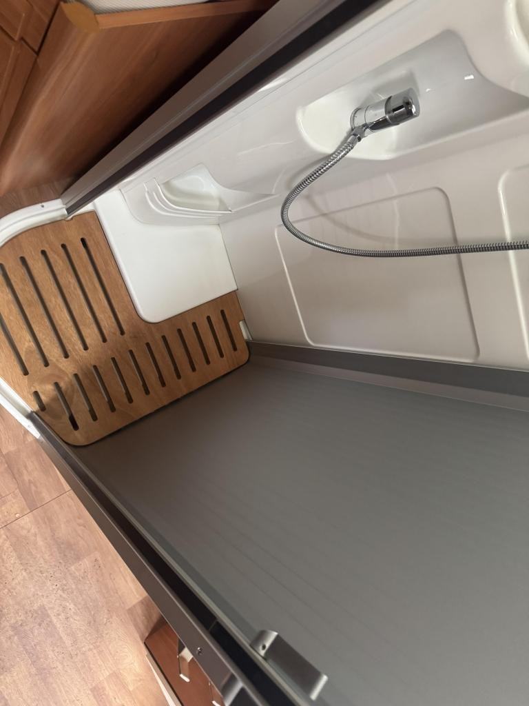 Kitchen & Washroom: The L-shaped kitchen includes a three-ring gas hob, a sink, and a large (142-litre) fridge with a freezer compartment. The washroom is split, with a separate shower cubicle on one side and a toilet/sink area on the other.