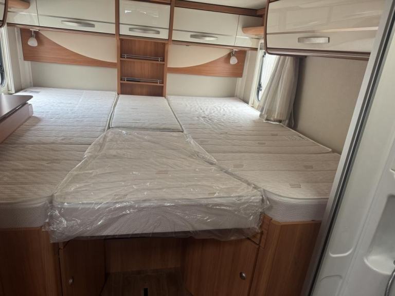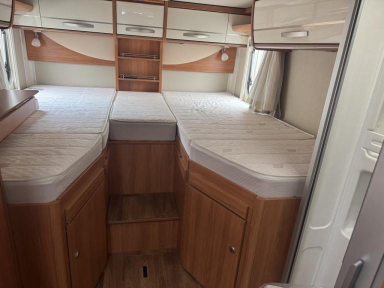 Sleeping & Seating: It offers 4 berths and 4 belted travel seats. The main sleeping area features fixed single beds at the rear (which can often convert into a king-size double bed), and a drop-down double bed over the cab area.