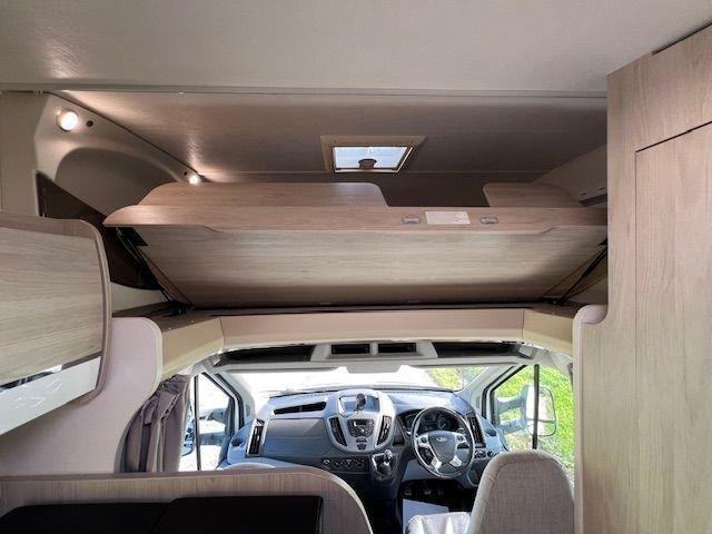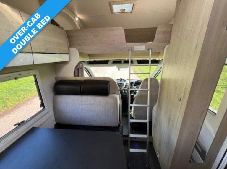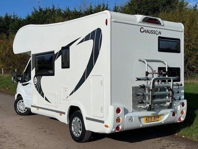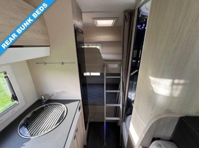 This Chausson Flash C646 features; 6 Berth, 6 Belted Seats, Over Cab Double Bed, Dinette Converting To Double Bed, Rear Bunks, Front Dinette inc. Extendable Table and Seating, Mid Bathroom, Wardrobe, Thetford Triplex 2 x Burner, 1 x Hotplate Hob, Oven and Grill, Sink and Drainer, Tall Fridge-Freezer, TV, MaxView Aerial, Extensive Cupboards, Fitted Blinds-Nets, Webasto Diesel Heating, Truma Water Boiler, 2 x Door Rear Garage, Bike Rack.