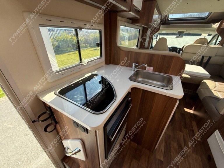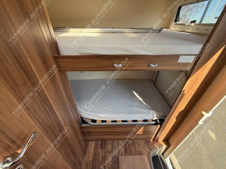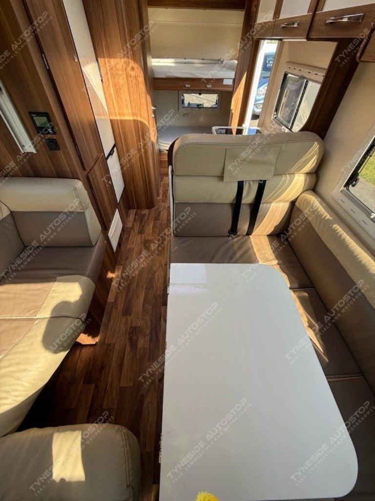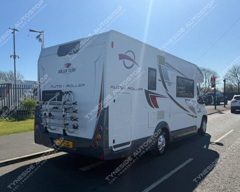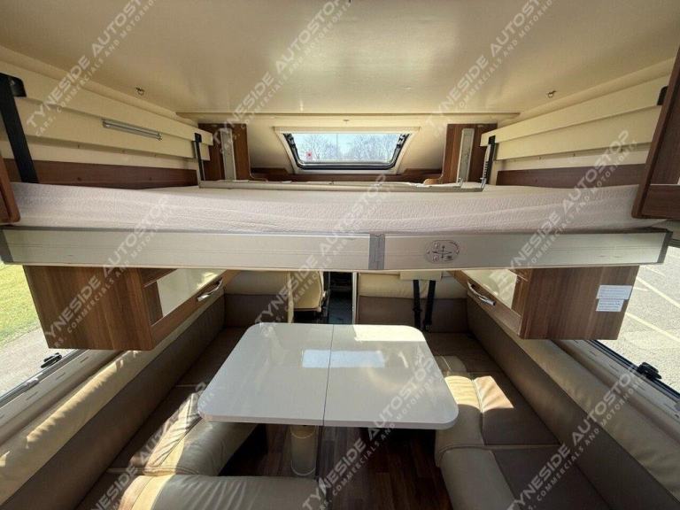 2019 (19) ROLLERTEAM AUTO-ROLLER 707 6 BERTH MOTORHOME WITH 4 EXTRA TRAVEL SEATBELTS 6 IN TOTAL, LOW PROFILE VEHICLE AND GREAT STORAGE OPTIONS ALL ROUND INCLUDING GARAGE SPACE, TOWARDS THE REAR IS FIXED BUNK BEDS THE BOTTOM BUNK LIFTS TO GIVE A LARGE GARAGE, TOWARDS THE FRONT IS A FANTASTIC SIZE LOUNGE AERA WITH SEATING BOTH SIDES AND A DINING TABLE, THE FRONT LOUNGE AERA ALSO MAKES A DOUBLE BED, ELECTRIC DROP DOWN DOUBLE BED TO COMPLETE THE 6 BERTH LAYOUT, KITCHEN AERA WITH WORKTOP SPACE, BUILT IN OVEN AND GRILL, 3 GAS BURNER HOB, LARGE FRIDGE-FREZZER, SINK WITH A MIXER TAP, SHOWER ROOM WITH A TOILET, SINK, SHOWER, AND VANITY MIRROR, LED LIGHTS, 3 PIN PLUGS, TV INPUT AND BRACKET, LPG GAS, TRUMA HEATING, PRIVACY BLINDS, SKY LIGHTS, GREAT STORAGE OPTIONS ALL ROUND INCLUDING CUPBOARDS, WARDROBE SPACE, OVER HEAD CABINETS AND GARAGE SPACE, AWNING AND A BIKE RACK FITTED, 3500KG, AIR CON IN THE CAB, EURO 6, VEHICLE EX RENTAL