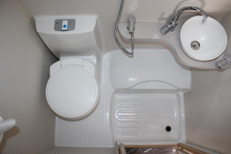 Integrated wet room with toilet, hand wash basin and shower