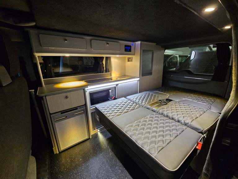 Van Lidz Pop Top Roof, 2 Burner Hobs, Large Sink, 50L Compressor Fridge, Cupboard Space, Control Panel For Power, Water Pump, 240v Hook Up, Leisure Battery, Leisure Battery Trickle Charger For Mains Hook Up, CTEK 250SE DC - DC Charger, Fold Out Bed Rock And Roll Bed With Fabricated Mattress, Blinds, Hard Floor, Table, Work Tops, Overhead Storage, Coloured LED Interior Lights, Reading Lights, Long Cupboard, Gas Bottle Storage And Strap, and Option for Swivel Seat And Much More...