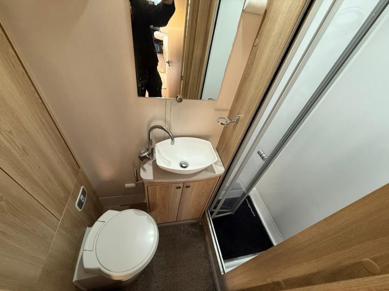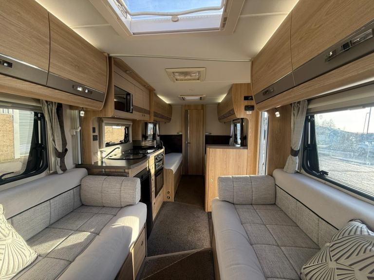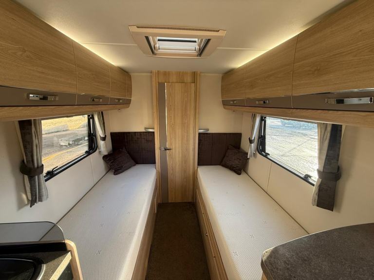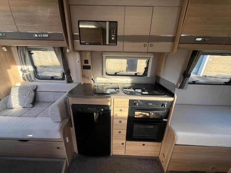 Euroway Leisure are pleased to present this immaculate 4 berth Elddis Magnum GT 185 for sale. The van has stunning features throughout with a comfortable lounge area to the front in a light grey giving this van a very modern feel. The kitchen to the centre of the van as you can see from the photos is like new. It features sink, hob, fridge freezer, oven and grill. Towards the rear you have 2 fixed single beds which has become more popular nowadays as it gives your own sleeping space and you can get out of bed without having to climb over each other. A good size bathroom to the rear of the van with plenty of storage, separate shower unit, sink and loo. Bike Rack and solar on the roof for off grid use and the advantage of the wind out awning so it's ready to go!! The van also has the all important 2 extra front facing traveling seats under the front lounge.