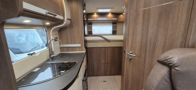 Kitchen: The galley-style kitchen features a three-burner gas hob, a circular sink, and ample storage, with some models featuring a large 160-litre fridge/freezer.
