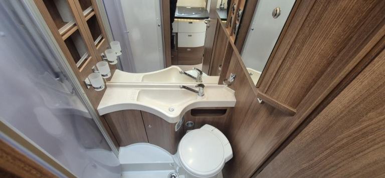 Washroom: The bathroom is well-sized for the vehicle's footprint. It includes a swivel-head cassette toilet, a molded sink unit, and a separate, circular shower enclosure.