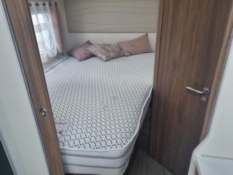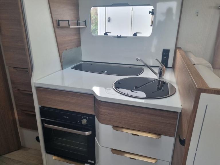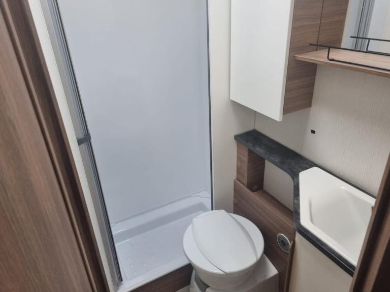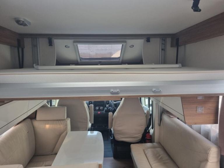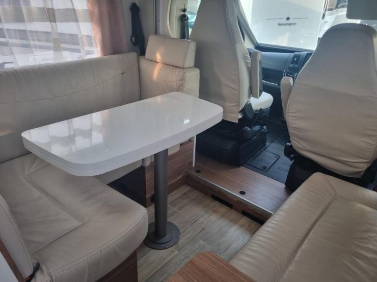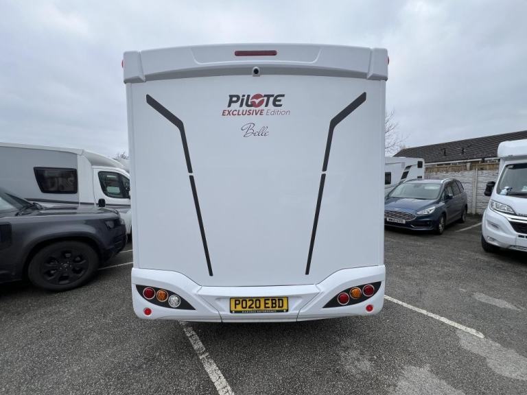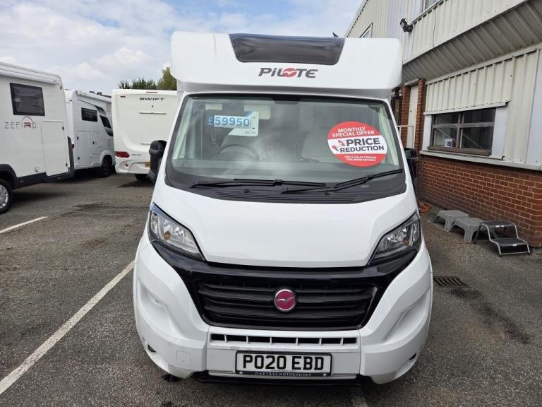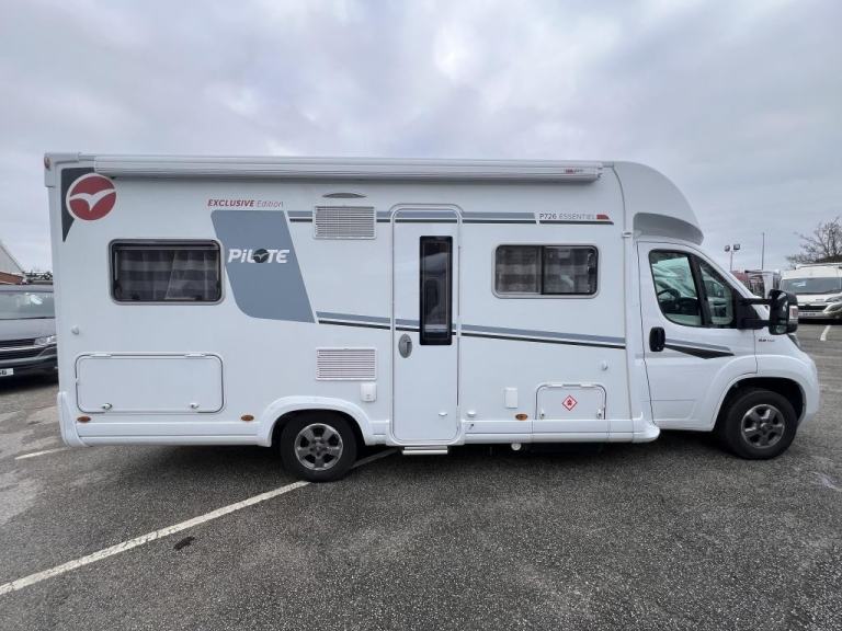 2020 Pilote P726 Essential Exclusive Luxury 4 Berth Low Profile Motorhome with End French Bed, Side Washroom, Front Electric Drop down Bed, Spacious living area, 5 Travelling Seatbelts and Under bed locker storage. Many features in addition to the standard specification including Media system with DAB, Reverse Camera, Wind out canopy, Solar Panel, Alloy wheels, External 240v point, Aluminium Trim, USB points, Cab Air-con, Steering Wheel Controls, Remis Cab Blinds. Fiat Ducato 2287 engine Euro 6 Diesel engine with a manual six speed gearbox. Step inside the motorhome, and you'll be greeted by a modern yet calm luxury interior. To the rear of the van features a side bathroom equipped with a walk-in shower cubicle, vanity sink with mirror, swivel style cassette toilet with electric flush, and a skylight giving natural light. The roomy French bed sits to the side with storage underneath for your belongings, and a half wardrobe and drawer unit completes, all easily enclosed with a solid sliding privacy door. Moving forward, the kitchenette area is a highlight, showcasing a tall 3 way Automatic fridge freezer, 3-burner gas hob, oven with grill, stainless steel sink, and ample drawer and cupboard storage space. The dining / living area offers comfortable seating for up to 6 people, with swivel captains seats an L shaped sofa and side bench, finished in cream leather upholstery. A large central folding dining table. Above is a Large electric drop-down bed measuring can be lowered to for access, accommodating the four berths. There is an additional 5th belt in the lounge area. The Cab features Remis concertina blinds, aluminium finish dash, Steering Wheel with mounted Controls, Cab Air-con, Cruise Control, 9” Media System, Driver & Passenger air bags, cup holder, Clip Board, Dual USB port Driver & Passenger air bags, Day time running lights & Fog Lights, Cab Carpet Fitted with the Truma Heating & Hot water are powered by Electric and Gas, Habitation Door Fly screen.