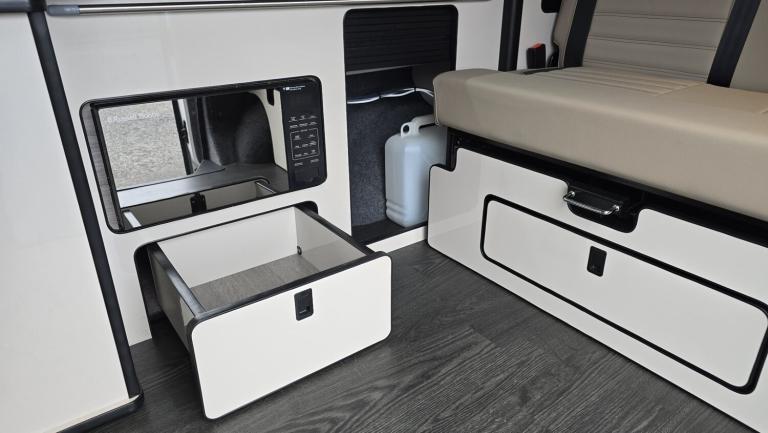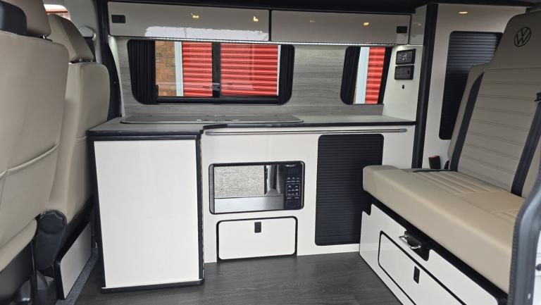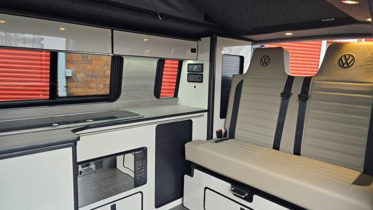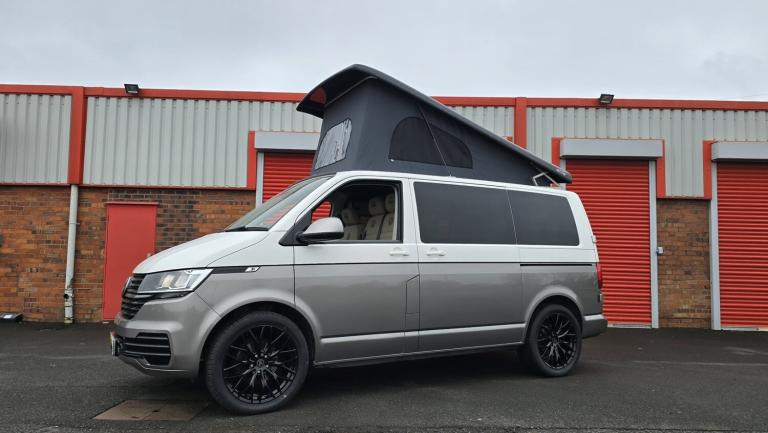 Volkswagen Transporter T6.1. 2020, 20 plate T6.1 finished in two tone VW Mojave Metallic and Candy White paint. SWB 2.0 110BHP. Full Service history with Cambelt and water pump changed. 96,911 miles. This is a brand new 4 berth conversion that has never been used. What's Included; West Dubs M1 tested poptop roof, Fabworx M1 tested bed, Fully carpet lined, sound deadened and insulated, Rusty Lee M1 tested sliding double swivel base for passenger seat, Smev 9222 double hob and sink, Gas locker (All our gas is installed by a registered Gas Safe engineer for complete peace of mind - Gas Safety certification supplied), 49L compressor fridge, 5 LED Touch on and dimmable spot lights, 12v socket, USB-A/USB-C socket, 12v battery condition monitor, Victron DC/DC bluetooth enabled split charger, 110 AH Leisure battery, 230v hookup, 230v 3-pin plug socket x2, BCA Power management system with built in battery charger.
