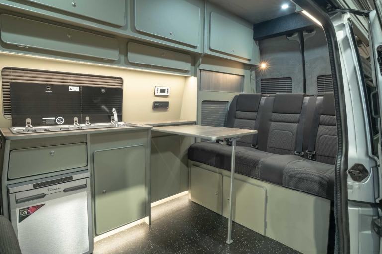 Featuring our classic high top conversion, fitted with a three belted crash tested RIB fold out seat bed /combo for complete safety and comfort you can take your adventure anywhere with this van as it comes complete with: Solar panel, On-board fresh water tank, Wind out Fiamma wind out awning, Two burner gas hob and sink unit, 50 litre fridge with removable freezer compartment, Plenty of storage and External shower point.