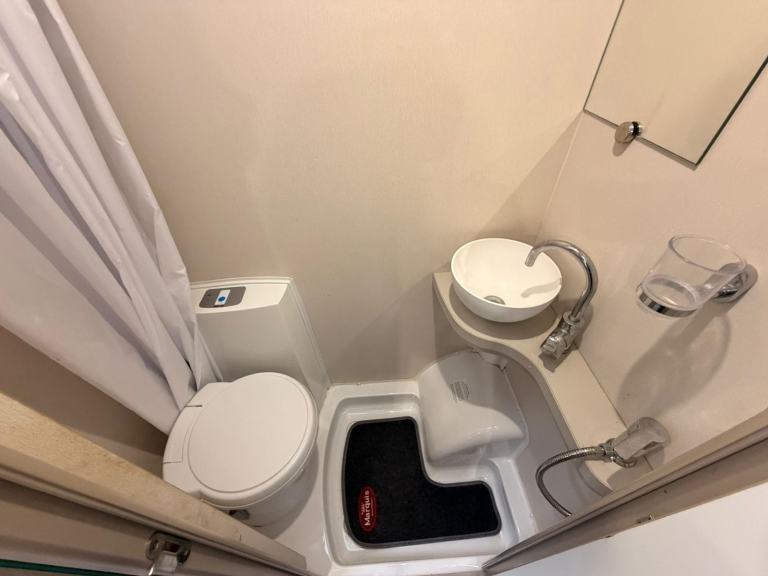 The fully equipped kitchen is ideal for cooking on the move, featuring a Dometic 3-way fridge freezer, Thetford duplex oven and grill, and a 3 gas + 1 electric hob, giving flexibility for both on-hook-up and off-grid cooking. The washroom includes a Thetford cassette toilet, wash basin, offering convenience and comfort for all trips.Year-round comfort is provided by the Whale water and heating system, while power management is enhanced by a Victron Energy battery monitor, newly fitted leisure battery, and solar panel system, perfect for off-grid touring.