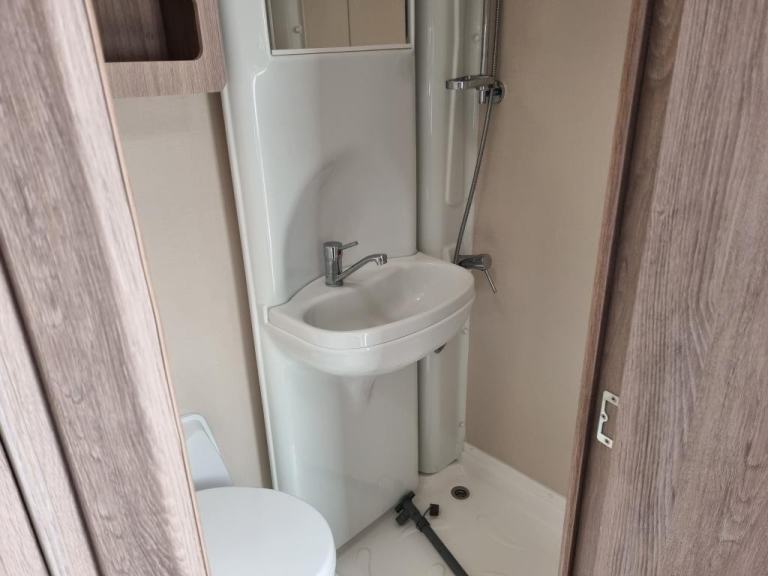 Washroom: A compact washroom with a vanity unit and a pull-out shower compartment.