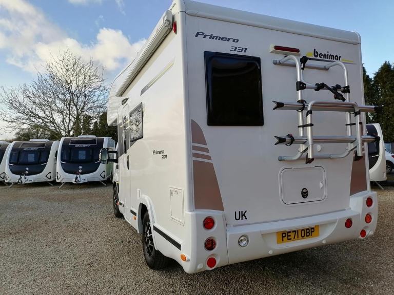 This used 2022 Benimar Primero 331 is on display at our branch. This 4 berth motorhome has an End bedroom / washroom. This motorhome comes with 12 months warranty. Full 100-point pre-delivery inspection. If you would like to hold this motorhome for 72 hours we can take a refundable deposit of £500 subject to you viewing the motorhome. If you require any further information on this motorhome either call one of our sales team., On Board Water Tank, 12v Power, Alloy Wheels, Awning Light, Battery Charger, Blinds, Cassette Toilet, Double Glazing, Flyscreens, Free Standing Table, Fridge, Fridge Freezer, Galvanised Chassis, Heater, Heki Rooflight, Hitch Stabiliser, Hob, Hot And Cold Shower Unit, Insulated Panels, Loose Fit Carpets, Mains Electric, Mixer Taps, Oven, Pull Out Bed, Shower, Shower Unit, Skylight, Smoke Detectors, Spare Wheel, Tv Aerial, Central Heating, Blown Air