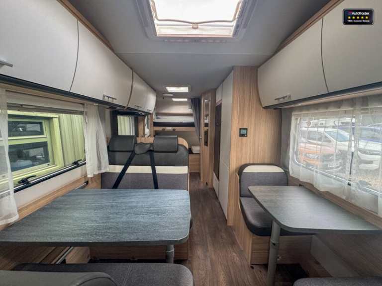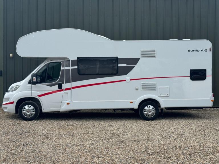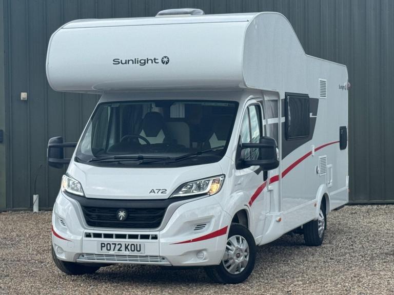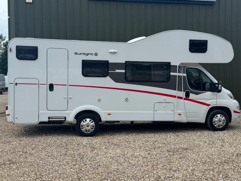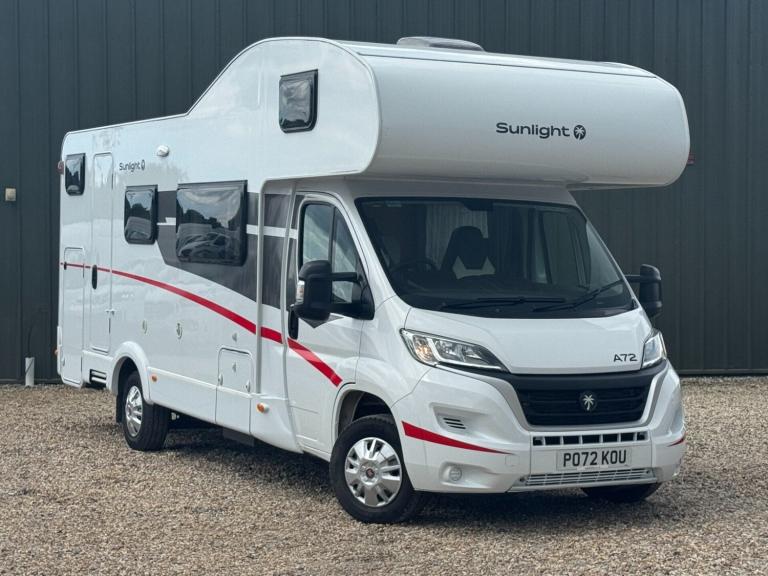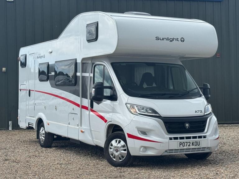 Sunlight is part of the ERWIN HYMER GROUP and sits underneath the Dethleffs brand. The Sunlight A72 is a 7.2 metre German built Motorhome with a fixed rear bunk beds, overcab front bed and central washroom. Built on the highly regarded Fiat Ducato chassis. A stunning 6-berth motorhome with 6-belted seats. Mass in running order (kg) 2860 Payload (kg) 640 MTPLM (kg) 3500 Total Height (mm) 3140 Total Width (mm) 2320 Total length The Sunlight A72 motorhome is a spacious and practical choice for larger groups or families seeking comfort and convenience on their travels. With its generous interior, this motorhome comfortably accommodates up to six people across king size, double bed and 2 bunk beds, ensuring everyone has a cozy place to sleep. The inclusion of a good size garage provides ample storage space for luggage, outdoor equipment, and more. Additionally, the Sunlight A72 features extended dining area, large fridge/freezer and a hob, Experience the joy of a well-equipped and versatile motorhome with the Sunlight A72, making every journey a memorable one.