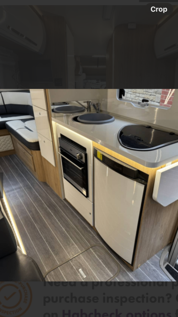 Kitchen Utilities and Appliances: Full gas cooker unit with oven and grilll, 3-way fridge freezer, sink and 12V powered tap, kitchen window, LED strip lighting and ample storage space.