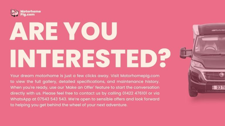 White, To see the complete specification, full description, service and ownership history, plus additional photos and information on this motorhome, please visit [Website URL removed] find everything you need there, including the option to make an offer directly through our website and the option to book an appointment to view.You can also browse our full range of motorhomes and get in touch with us easily through the site. We also offer part exchange of any vehicle type such as Car, Motorhome, Motorbike or any asset of value. We offer warranty options from 3 to 36 months (subject to terms and conditions), and guidance on finance to help you choose the best option.Walk around videos are also available upon request.Please feel free to contact us by calling on 01422476101. Alternatively, you can use our WhatsApp telephone number [Phone number removed]Registration: PO23FFXMotorhomepig are proud to offer this as a broker, available to view in Preston, Lancashire, 1 owners,