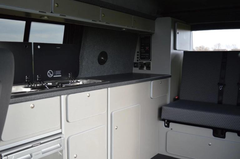 · FULL SIDE CONVERSION- It will include kitchen unit with 2 cutlery compartments and a large storage area, a small combination sink and 2 burner hob unit, with over kitchen storage unit. Wardrobe/ Cupboard unit with front door and 2 x rear doors. All the furniture in this conversion will be made from caravan/motorhome lightweight grade ply. We never use heavy, easy to damage chip wood, in our conversions. Full choice of furniture colours are available.