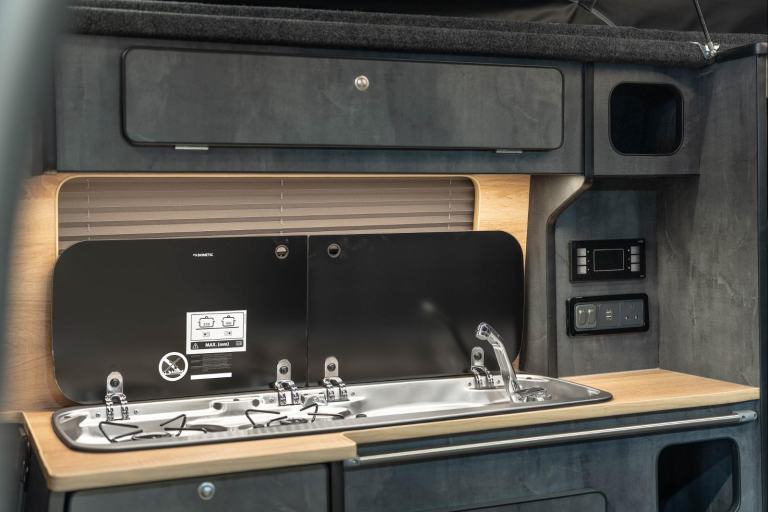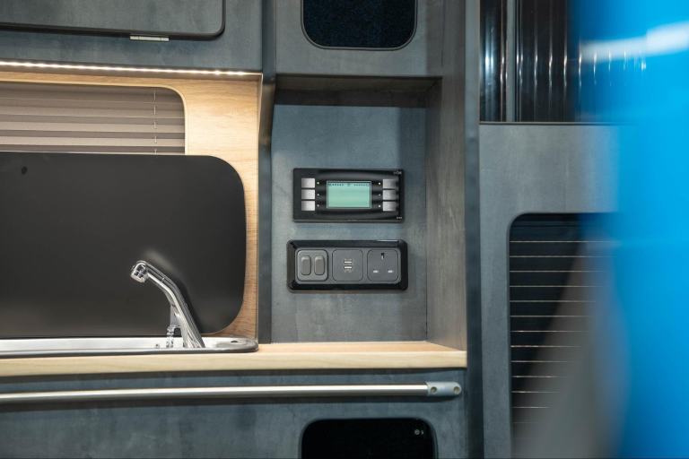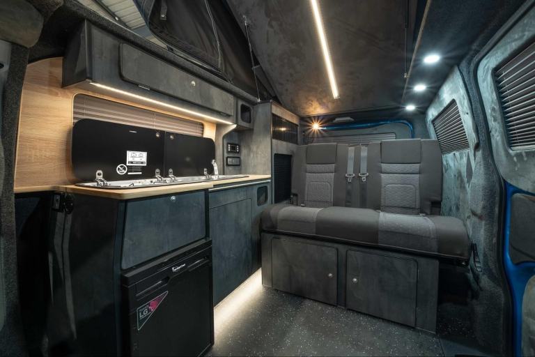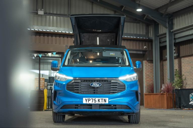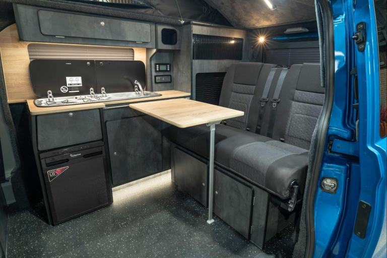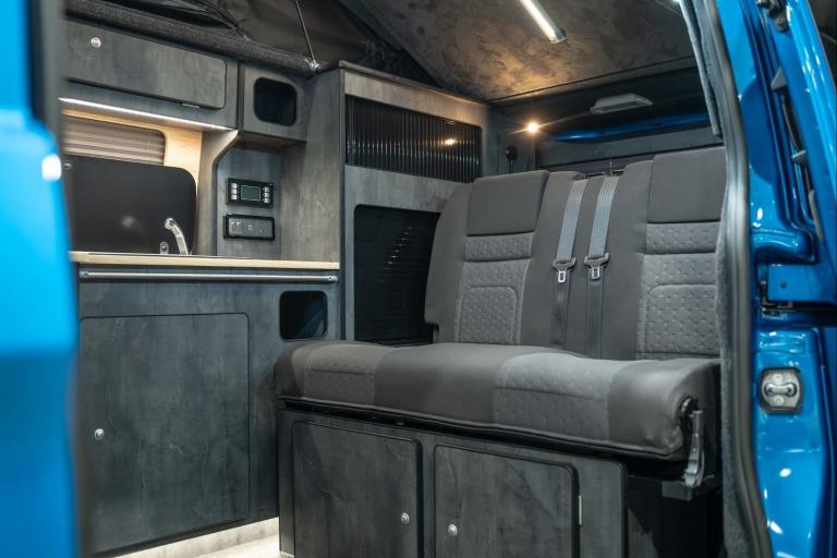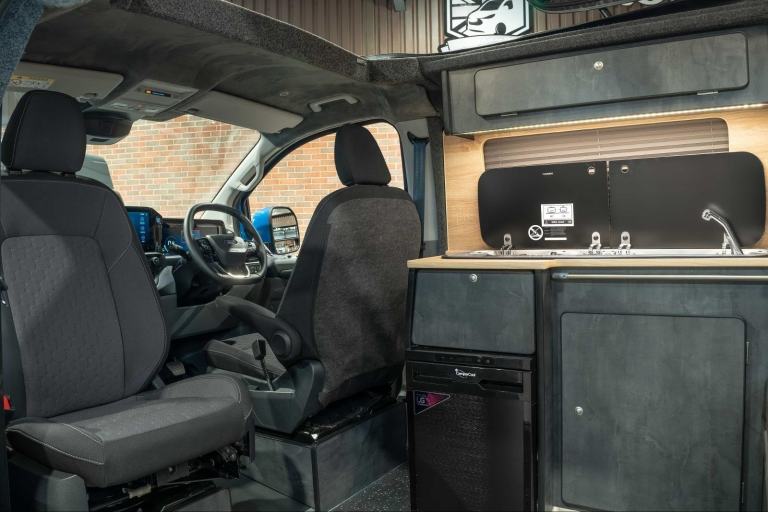 Brand New and just converted is this stunning 2025 Ford Transit Custom Limited Campervan finished in Digital Aqua Blue Metallic Paintwork. Professionally converted by our team with Slate Grey lightweight cabinetry and Bardolino Oak worktop, splashback and matching tables. The front single passenger seat is fitted to a swivel base, and the versatile RIB bed has been upholstered to match the original Ford Pin Hex pattern fabric on the front seats to maintain the OE look.