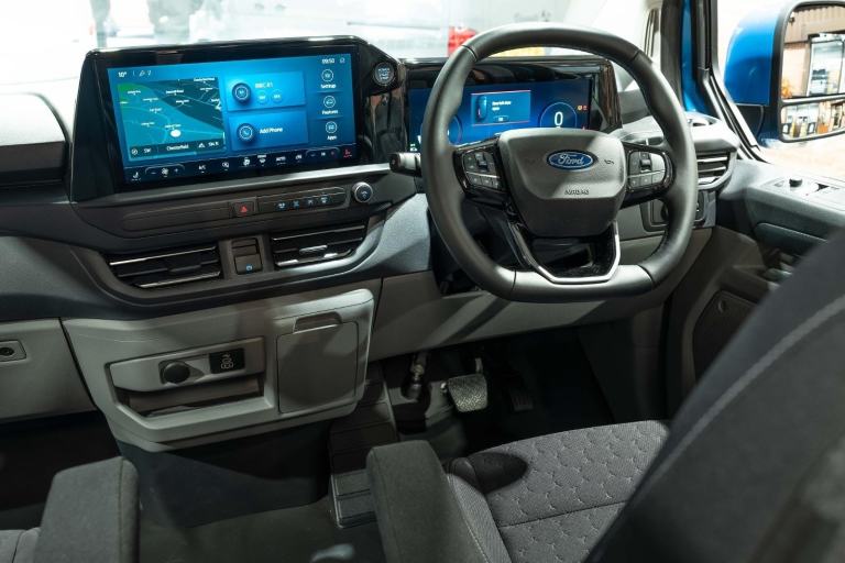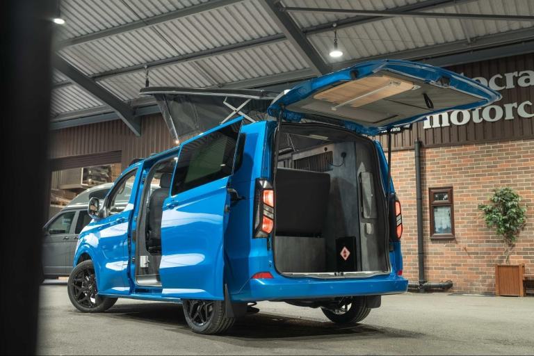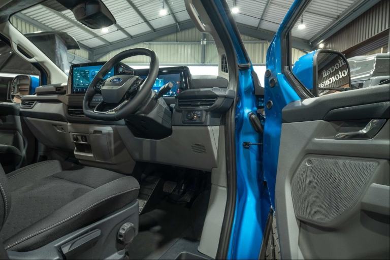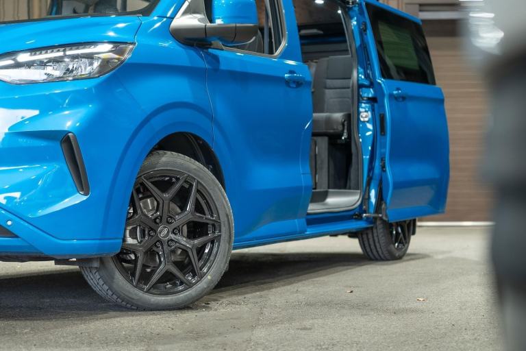 We have also upgraded the alloys from the standard size 16” to a set of gloss black 20” alloy wheels which suit the Aqua Blue paintwork perfectly while adding to the modern style of the new Transit Custom