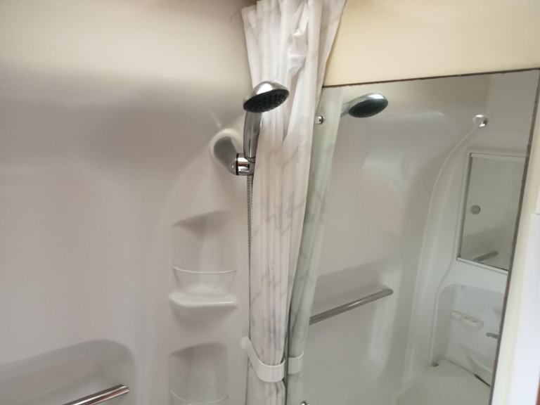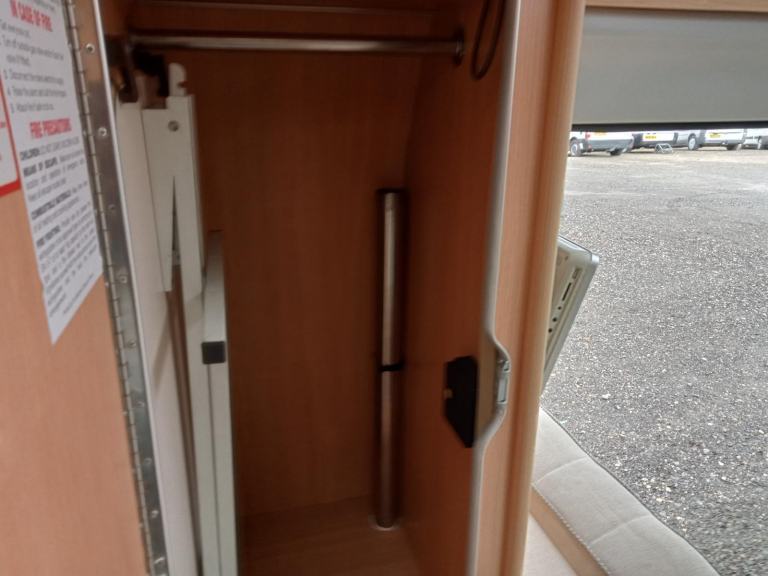 SIDE FACING BENCH SEAT WHICH PULLS ACROSS TO MAKE A LARGE DOUBLE BED, WARDROBE WITH FOLDING TABLE STORED AWAY FROM SIGHT, FULL GAS COOKER WITH GAS HOB OVEN AND GRILL, SINK WITH HOT AND COLD WATER, FRIDGE WITH FREEZER BOX, DECENT SIZE BATHROOM WITH SHOWER AND THETFORD FLUSHING CASSETTE TOILET AND VANITY UNIT, PLENTY OF CUPBOARDS AND STORAGE SPACE, BLIND'S,