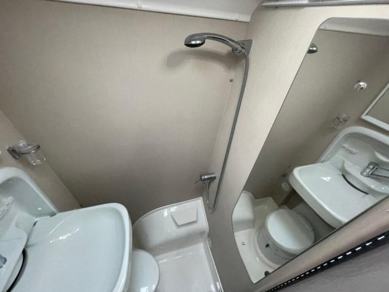Entering through the habitation door you have a large front lounge with a bench seat and large belted front facing seat; utilising the swivel seats you can comfortably entertain up to 5 people in this area. The seats also quickly make up your large 2 berth bed. Leading down you have ample space through a large corridor towards a fully equipped kitchen with 3 way fridge, sink, oven/grill combi and microwave. Opposite you have a large washroom with toilet, shower vanity mirror and storage.