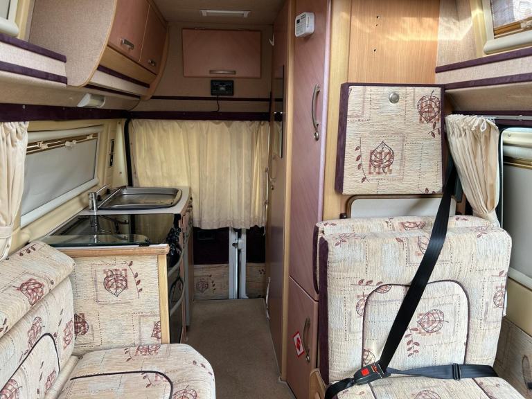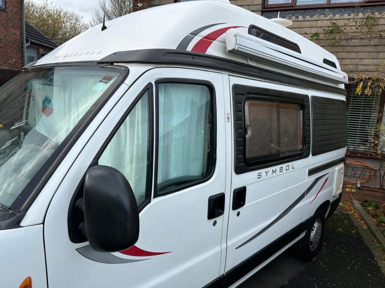 Here at Motorhome Depot Stockport we are delighted to have on offer a 2005 edition of an Auto-Sleepers Symbol for sale. This is based on the popular Peugeot chassis and has the 2.2 litre Diesel engine with the 5 speed manual gearbox and has a comprehensive service history as well as an Mot until Nov 2026. Starting at the rear, we have the kitchen area which includes 3 burner gas hob, grill, oven, hand wash basin and a 3 way fridge. Opposite is the washroom which is comprised of space saving drop down basin, bench style cassette toilet and separate shower controls.The main seating area includes 2 additional 3 point travelling seats and the drivers side seat will convert into a comfortable long bench if required and will also convert into a good sized double bed. The drivers and passengers seat will also swivel to give great seating options.