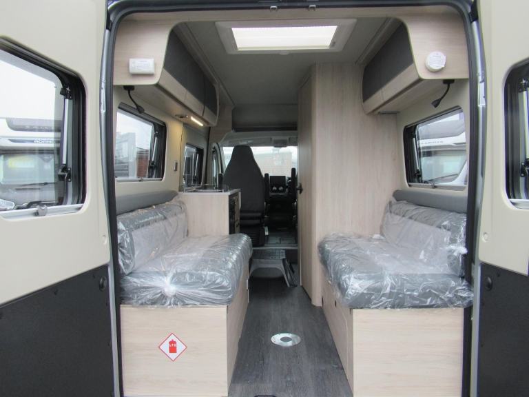 Off grid ready with a 120W solar panel, Twin leisure batteries, compressor fridge freezer and space for 2, 3.9 kg gas bottles.