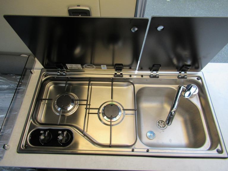Kitchen with 2 ring gas hob, oven with grill, stainless steel sink and compressor fridge