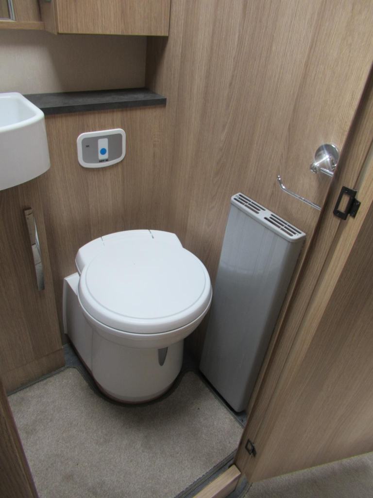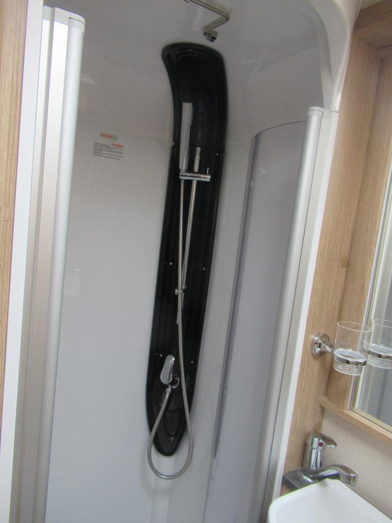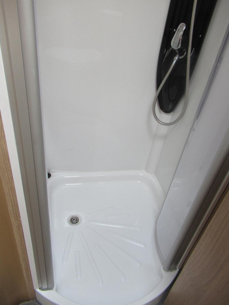 A spacious washroom featuring a separate shower cubicle sink and cassette toilet.
