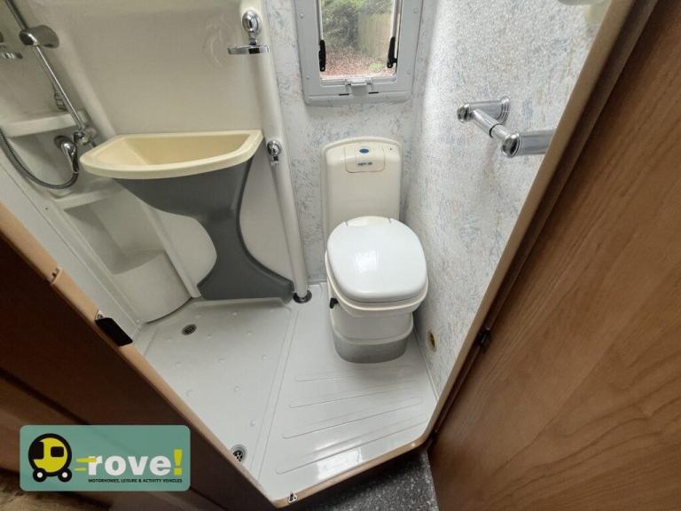 Opposite the Kitchen is a side bathroom, which has a sink, shower and Thetford toilet. It also has a moveable partition for when using the shower.