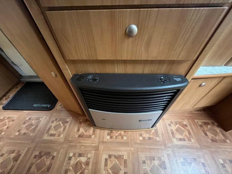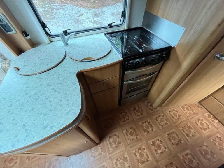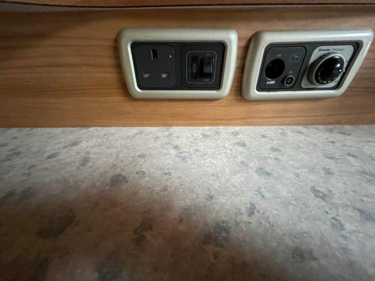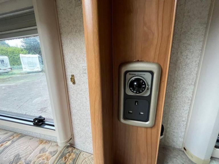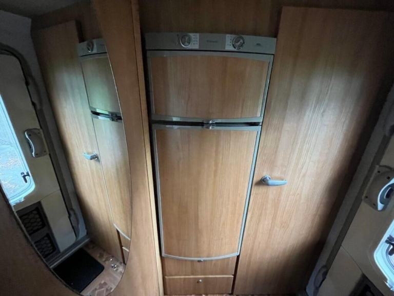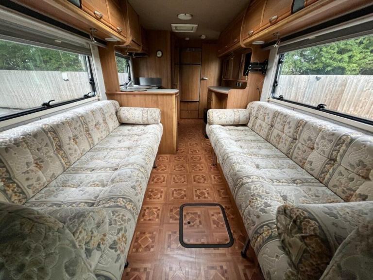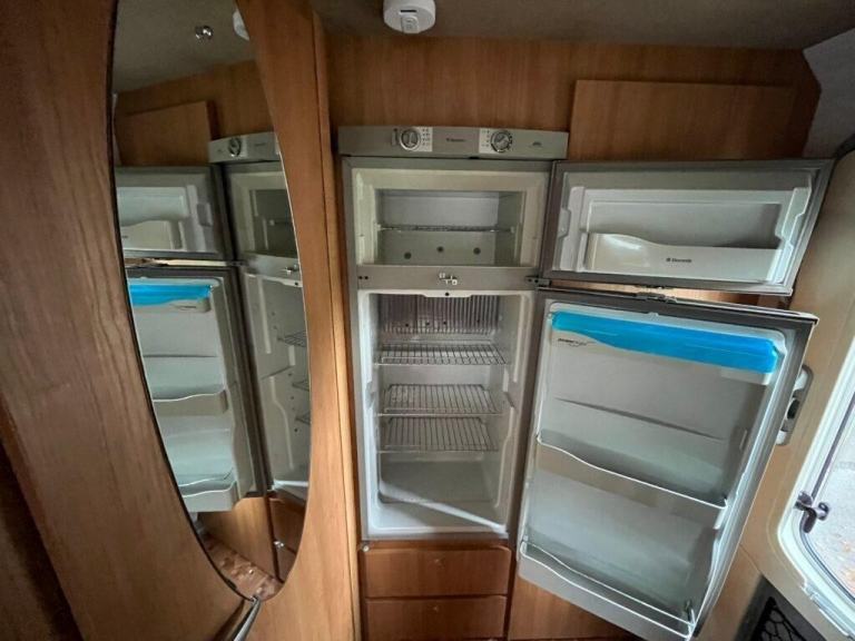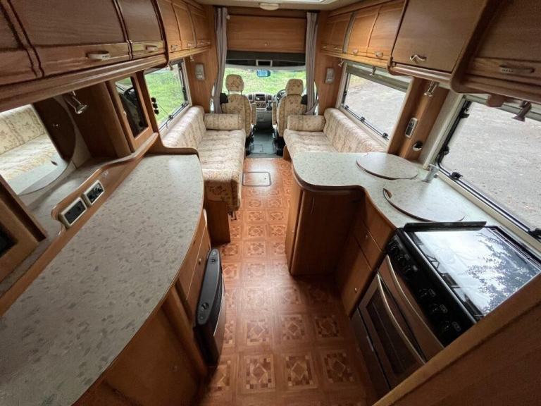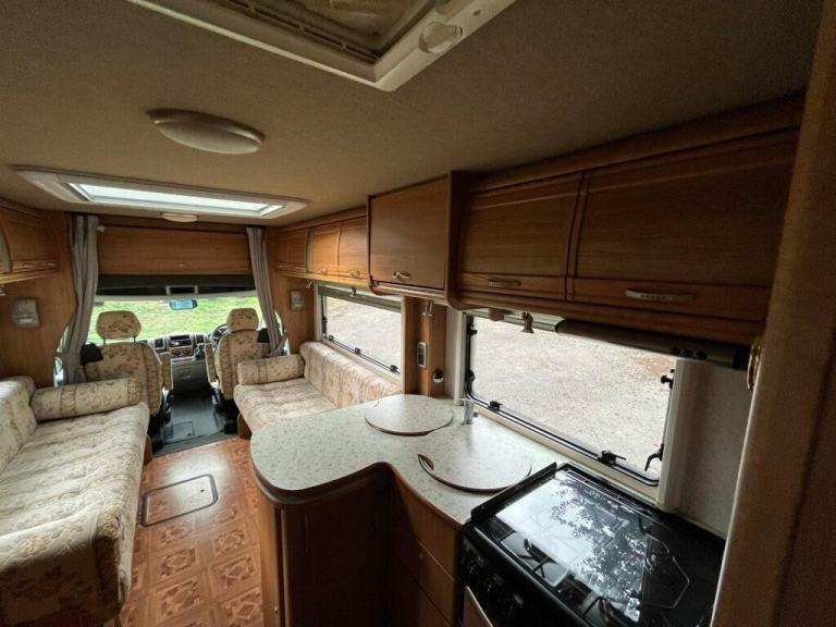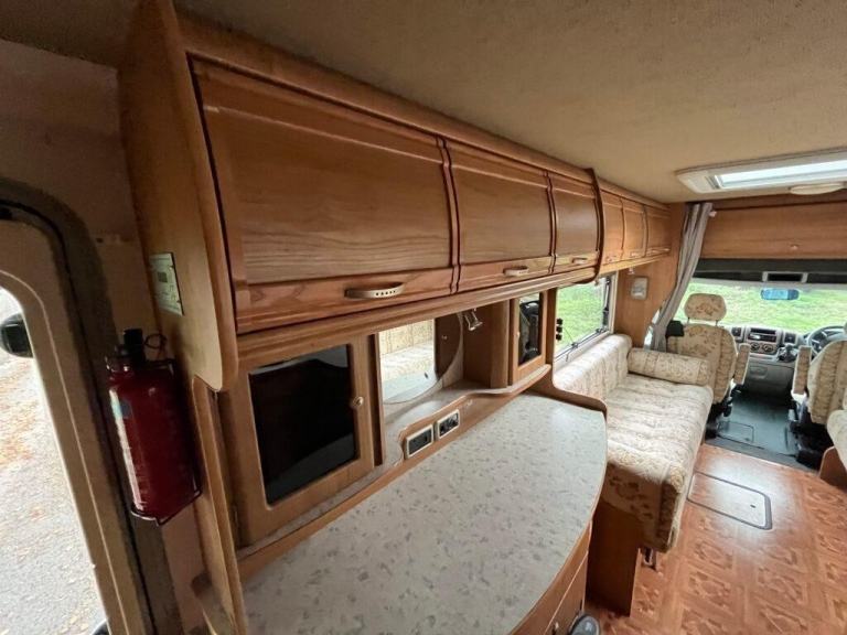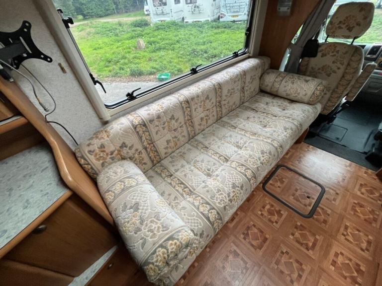 As you enter the motorhome you have immediately to your right a large wardrobe next to the large fridge with separate freezer. The washroom in the rear offside corner includes hand basin, cassette toilet and swing-wall vanity unit. The kitchen across the central area of the living space comprises gas oven, grill and dual-fuel hob, microwave, extractor, sink/drainer and lots of cupboard and worktop space. Front lounge consists of two side-facing settees and the swivelling cab seats, which can be set up as either two single beds or a transverse double. Plenty of storage space throughout. Gas and electric heating and hot water. Very spacious with high specification. Some of the extras that come with the motorhome are an awning/canopy and solar panel.