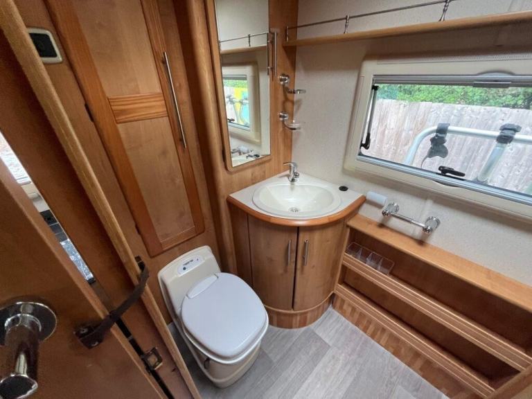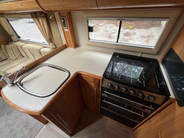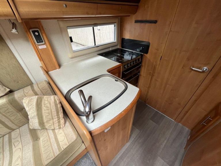 This is a well built motorhome with plenty of features, 4-berth, and lovely living space. Externally, the 'SE' pack gives you a large, recessed awning, plus external Shower and BBQ points. However, it is the inside where the 635 shines- to the left of the habitation door as you enter, are two, particularly inviting sofas (which convert to a double bed), leading to the two swivelling cab seats, which turn the whole area into a sociable dining/relaxing space. To the other side of the habitation door, a well-equipped kitchen area that comes with a full-size cooker with 3 gas rings and 1 electric and a tall 3way fridge. This leads to a very generous full width washroom, with separate shower cubicle, cassette toilet and wash basin.