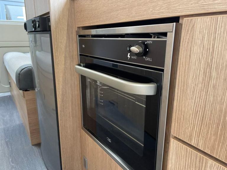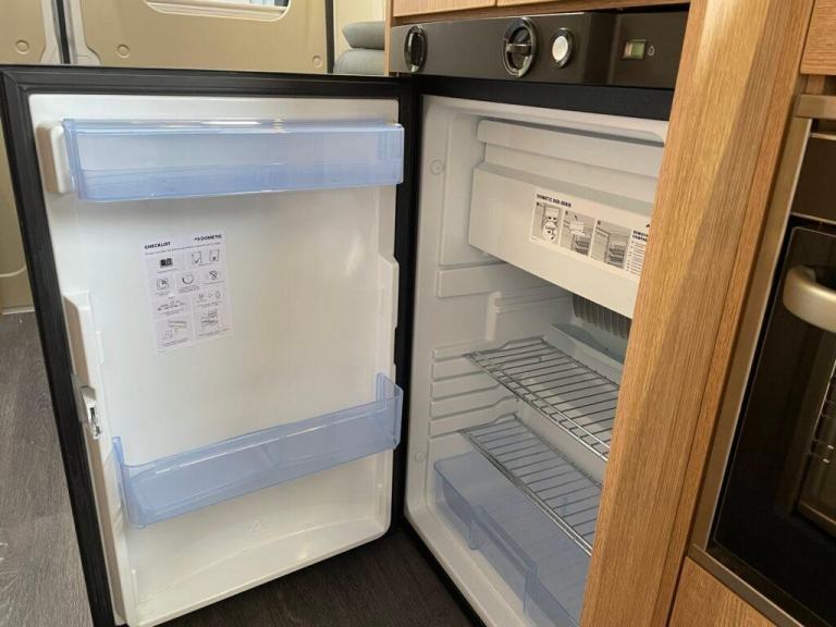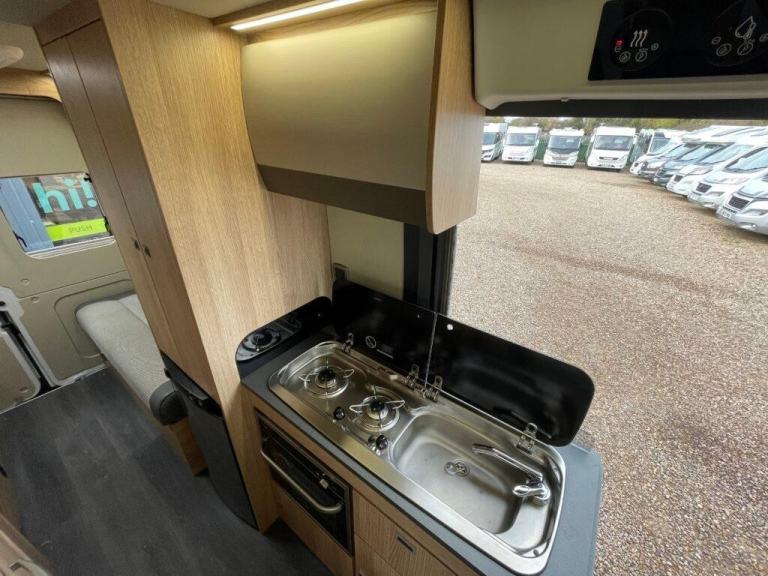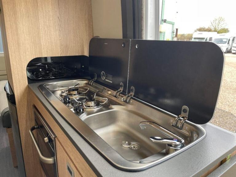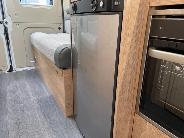 Moving forward, the central kitchen is compact but cleverly designed for maximum efficiency. It includes a two-burner gas hob, oven and grill combination, stainless-steel sink with mixer tap, and a fridge with freezer compartment. The worktop space is complemented by additional fold-down surfaces, making meal preparation simple and convenient. With smartly designed cupboards and drawers, there’s ample space for cookware and supplies, ideal for extended trips.