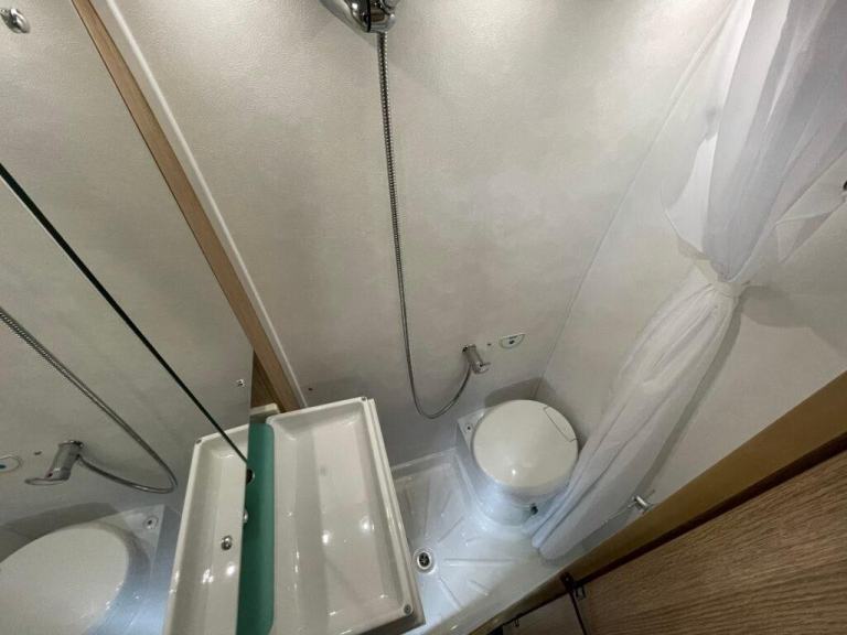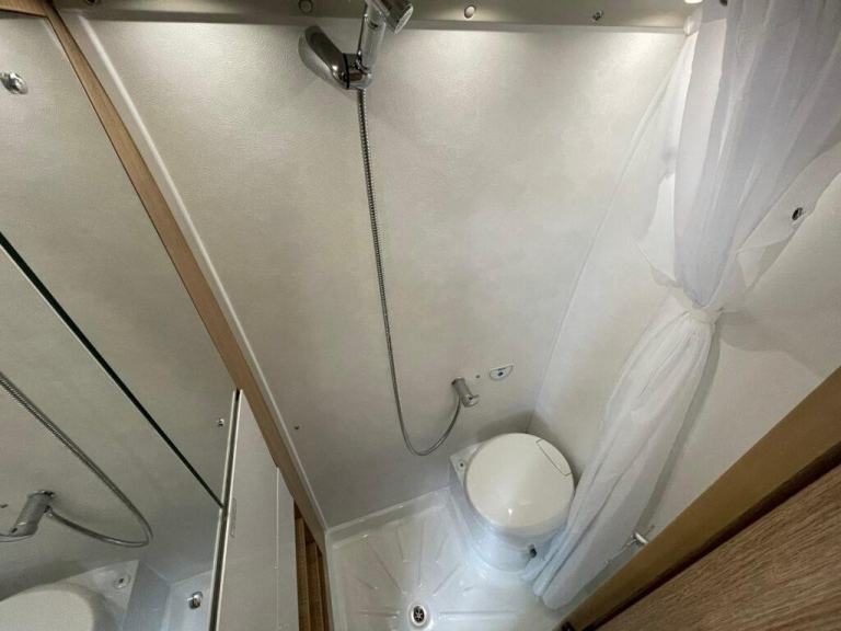 Opposite the kitchen sits the washroom, efficiently laid out with a swivel cassette toilet, drop-down sink, mirrored cabinet, and shower facility. Despite the footprint, the washroom feels bright and usable, with durable materials and clever storage making it both practical and easy to maintain.