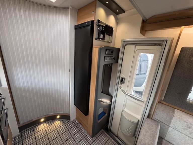 Full rear spacious dressing room incorporating separate shower cubicle, toilet , wardrobes and vanity unit - central offside kitchen benefitting from a tower fridge - central lounge / dining area / double bed with 2 concealed travelling seats - ELECTRIC drop down double bed above