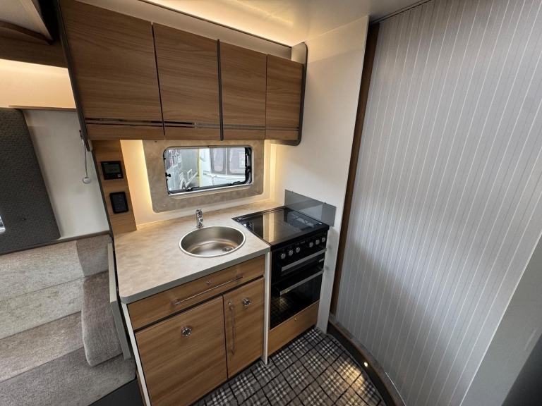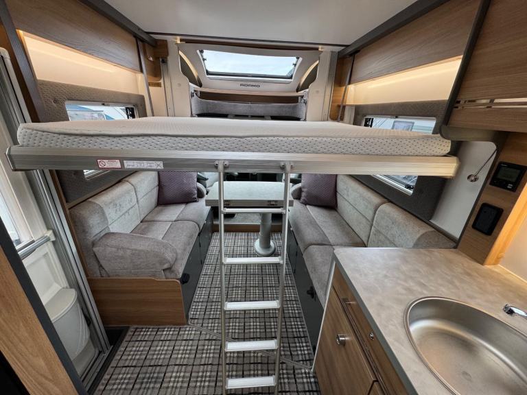 Full rear spacious dressing room incorporating separate shower cubicle, toilet , wardrobes and vanity unit - central offside kitchen benefitting from a tower fridge - central lounge / dining area / double bed with 2 concealed travelling seats - ELECTRIC drop down double bed above