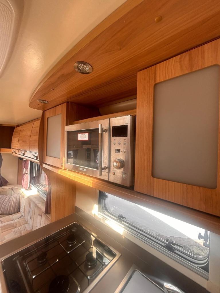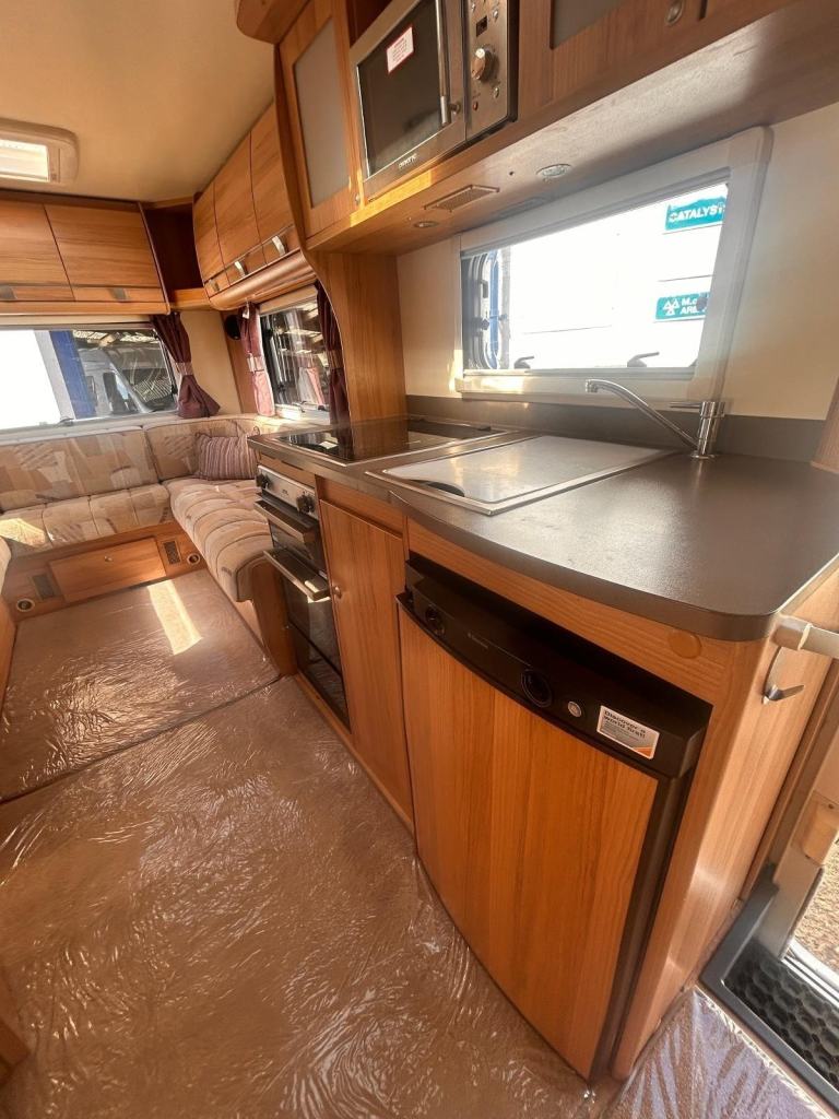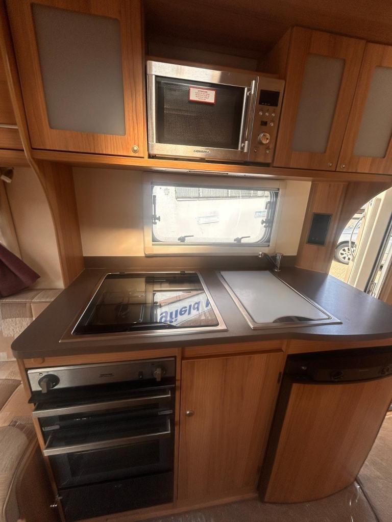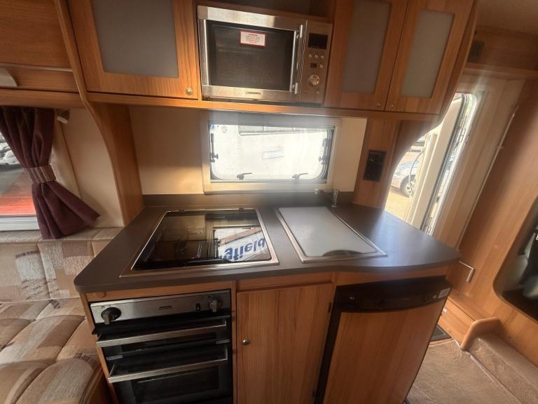 2013 Bailey Approach SE 625 Just 48700 miles, 2 berth with the large U shaped rear lounge. The kitchen is equipped with a three way gas and electric fridge, 240 volt microwave, full cooker unit with 4 gas hobs and a grill and oven underneath.