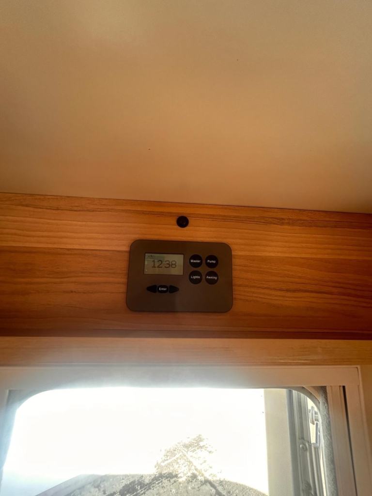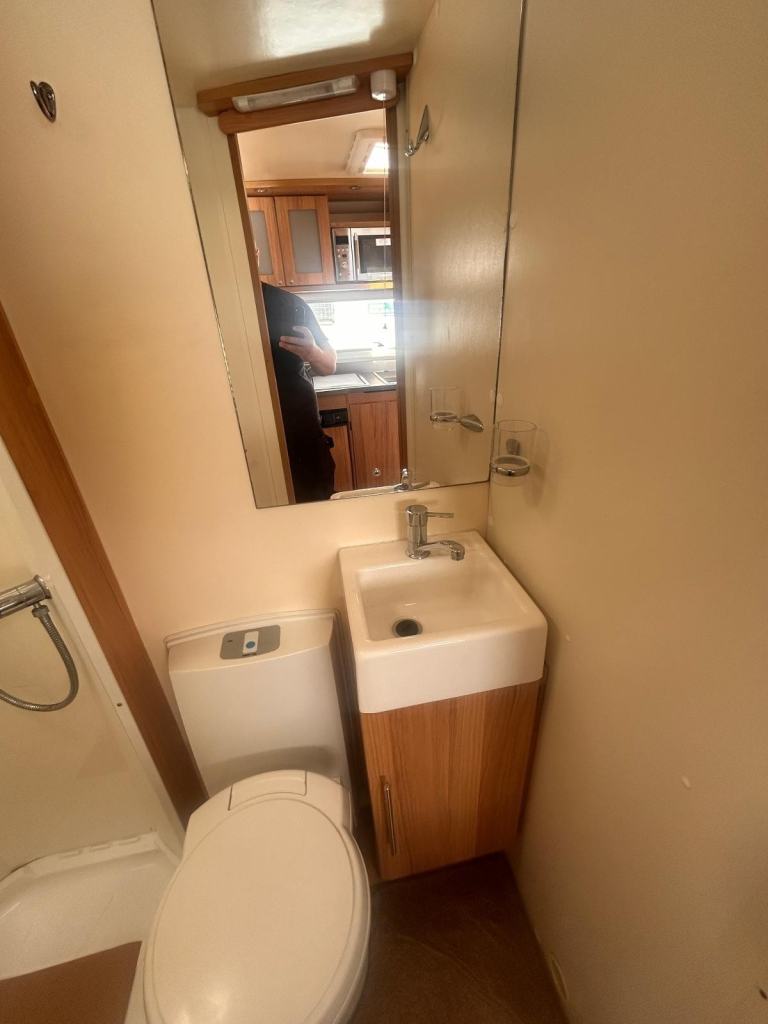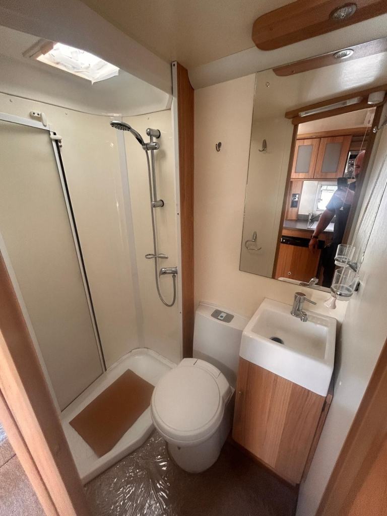 It has Truma blown air heating and water heating on gas and electric power. It has the separate shower cubicle in the bathroom. There is cab air con, reversing camera, side wind out awning, a bike rack, tv aerial and a solar panel also fitted.