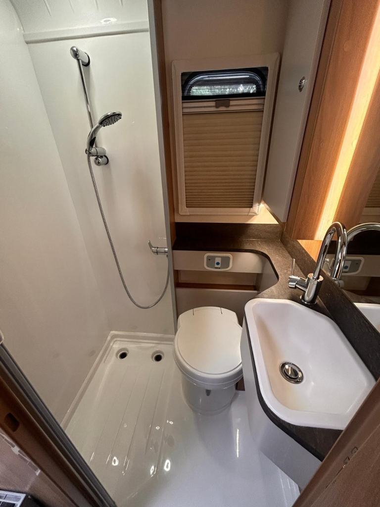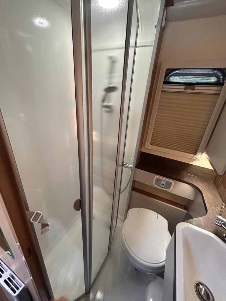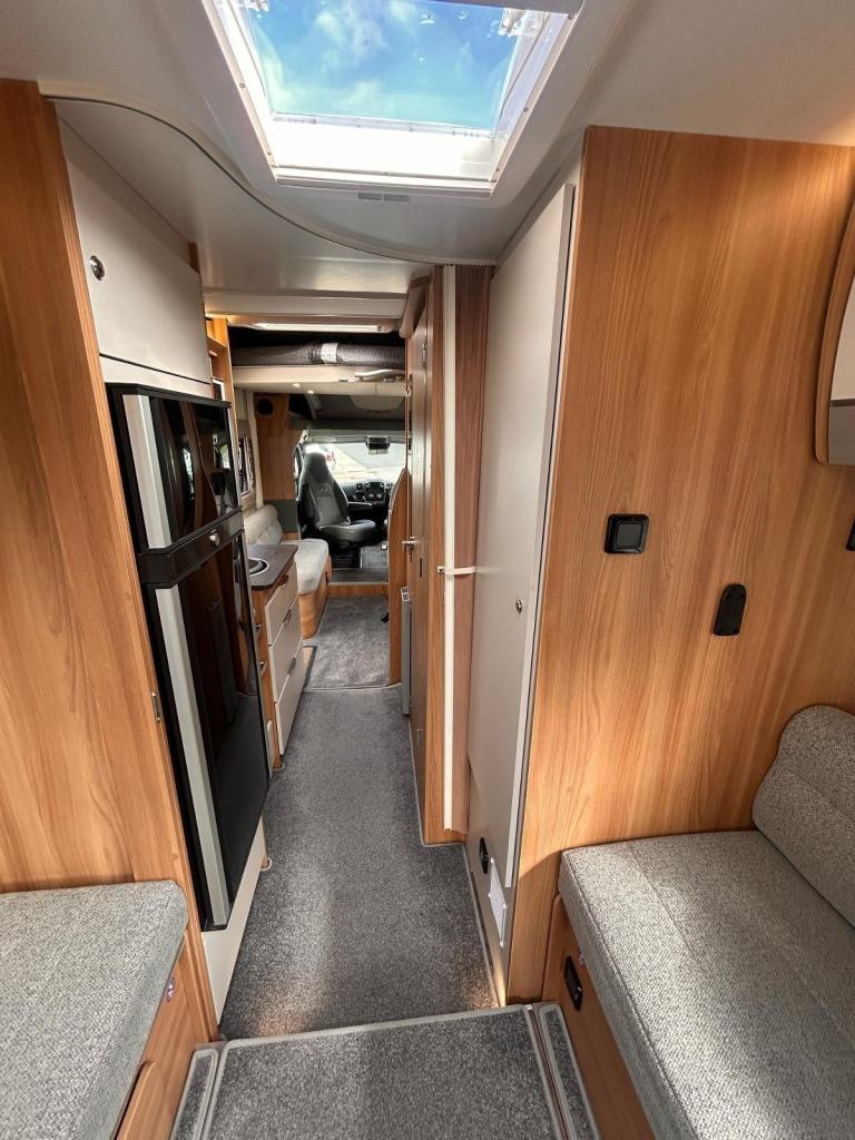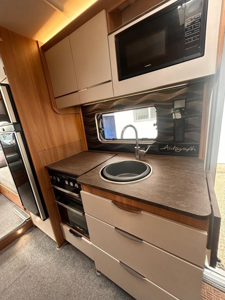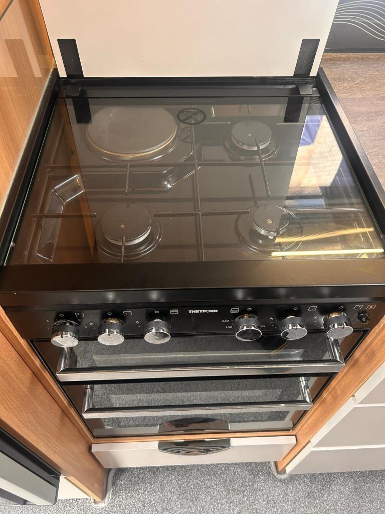 The kitchen has the full cooker with 240 volt hot plate and 3 gas burners as well as a separate grill and oven. There is a full sized fridge with freezer w=ith doors that can open from both sides! It has the best ALDE heating, by far the superior heating choice for these motorhomes!