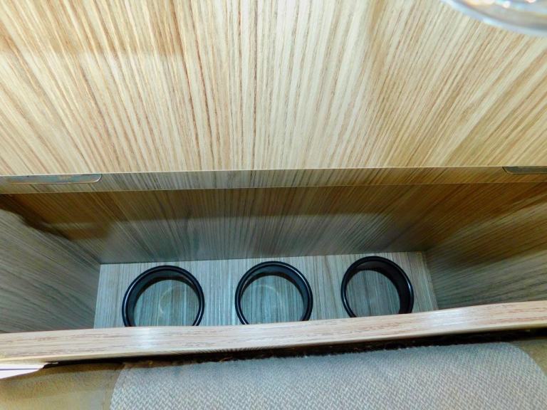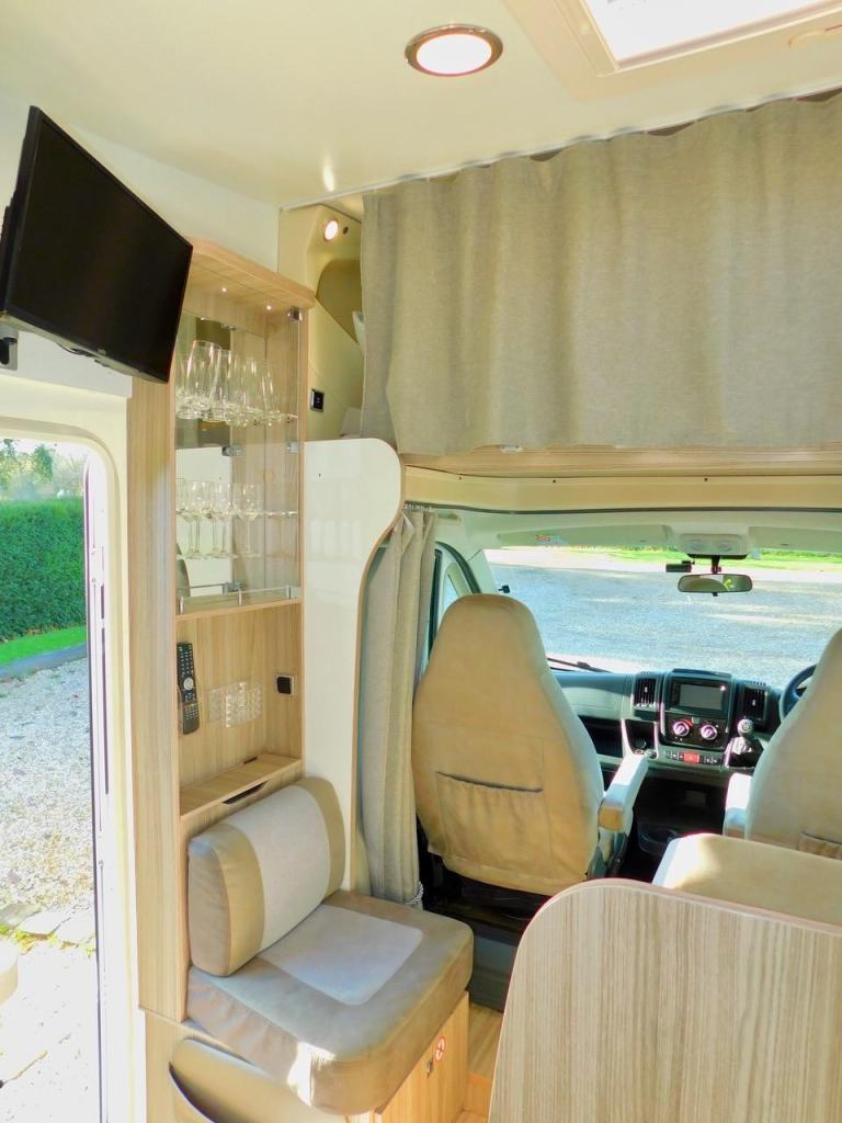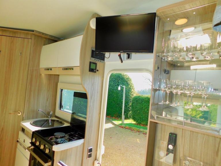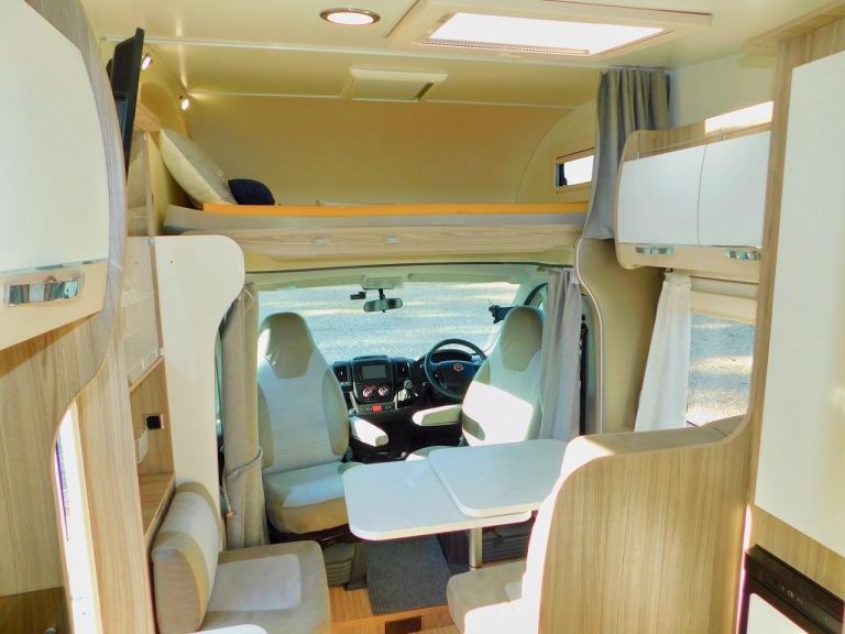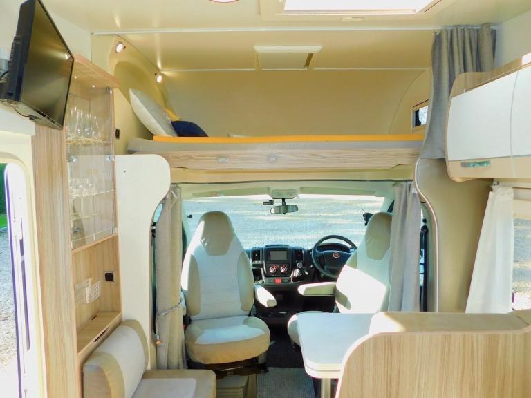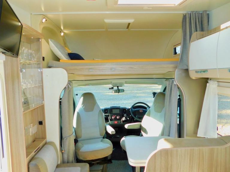The Lounge and Dining Area has Seating for 5 with its Swivelling Front Driver and Passenger Seats, and the Dining Table has a Swivel Extension to enable all 5 people to Dine in Comfort. There is a Glasses Cabinet as well as an LED TV. There I s also a roof mounted Digital TV Aerial.