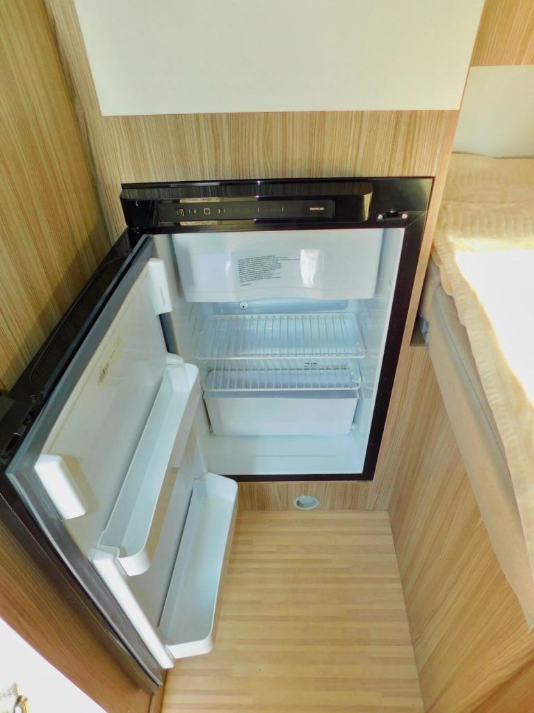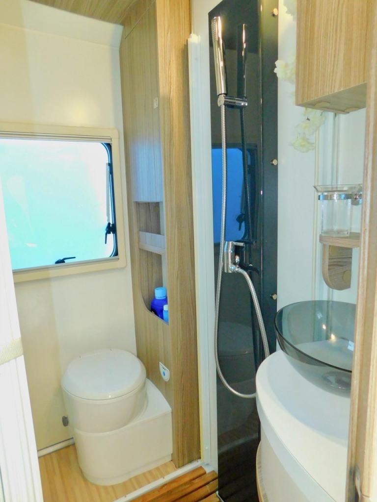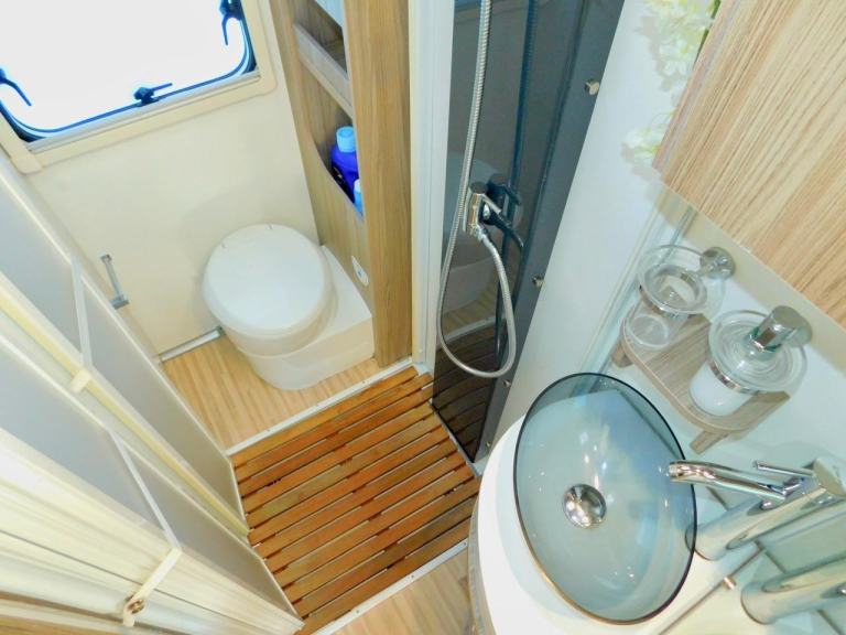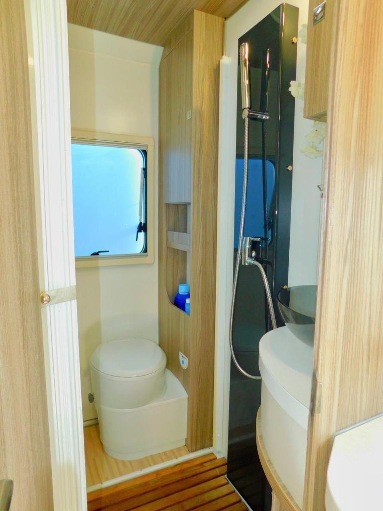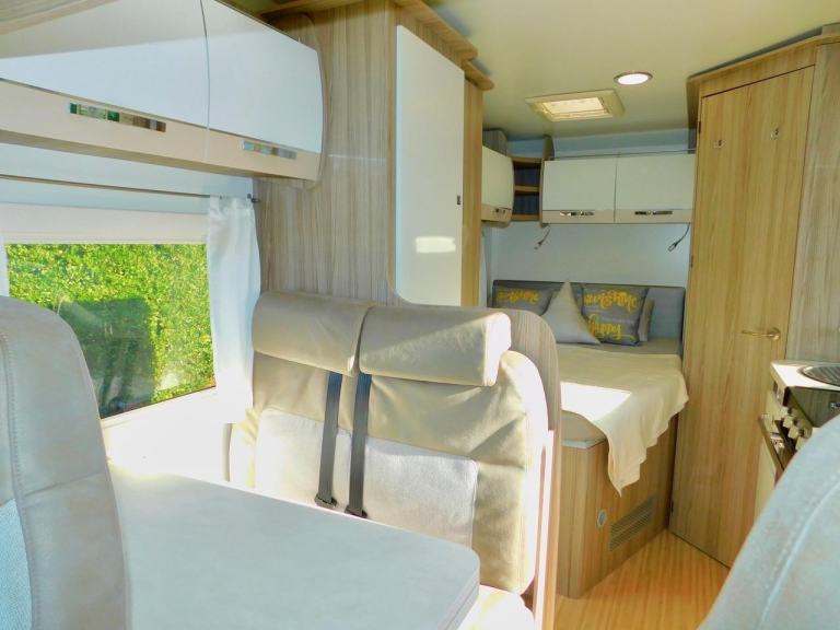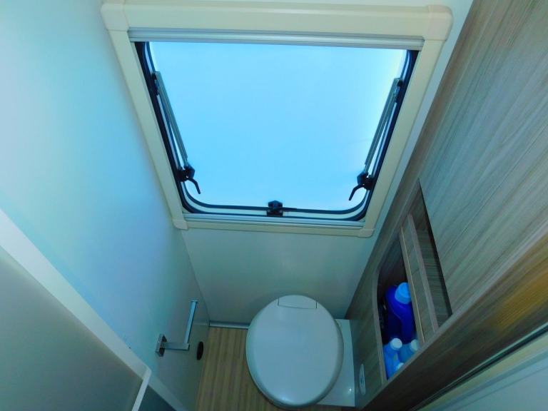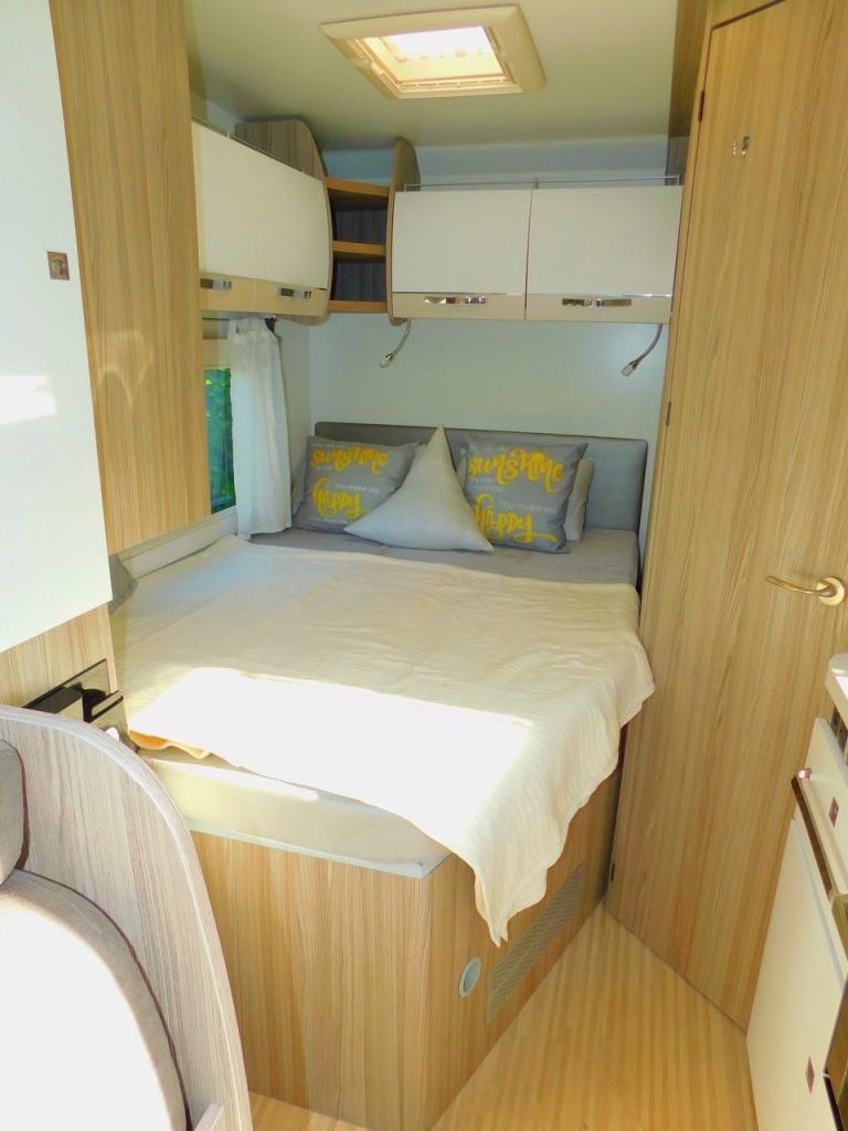 When it comes to mum and dad’s bedtime, the French bed (that’s a lengthways double alongside a wall) positioned here at the offside rear is a decent size and, again, requires no bed-making. This Bed is 1.90m (Or 6 feet 2 Inches) by 1.36m (4 feet 5 Inches) but neither the overhanging (second) wardrobe at the foot, nor the usual tapering bed width, will compromise comfort significantly.