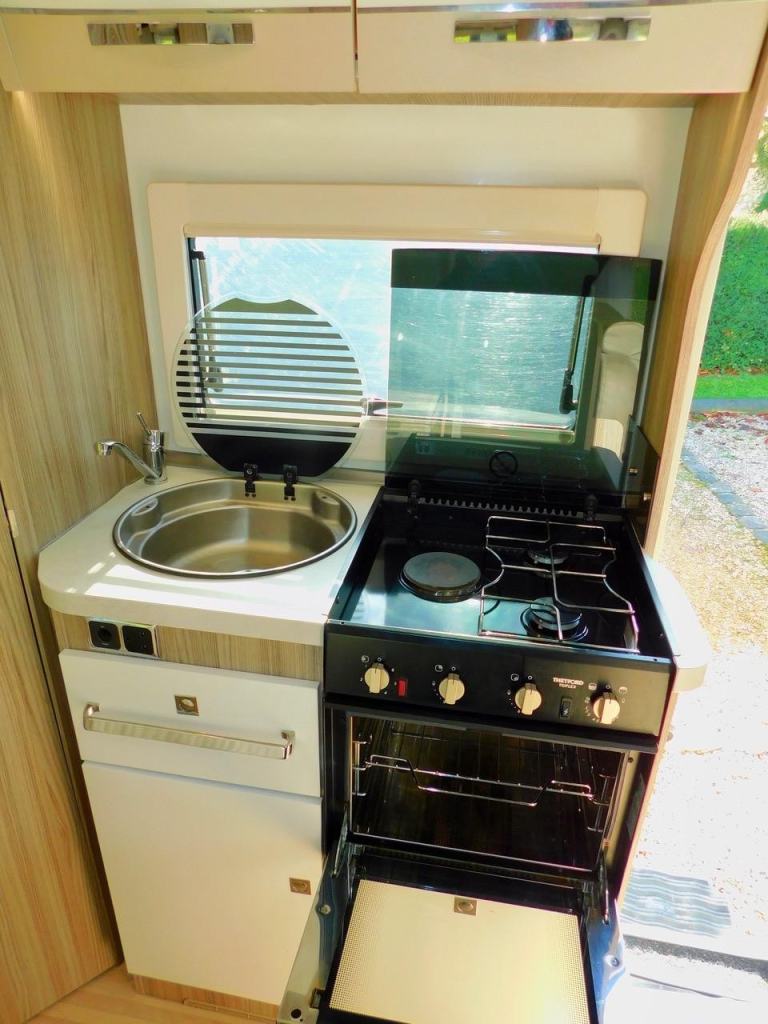 And, despite this Primero’s diminutive length, you could consider using it as a four-berth on a regular basis. There are four travel seats, of course, thanks to the half-dinette-style lounge but it’s the overcab bed that really makes a difference. Here’s an instant, always-available double (which the brochure says is a mightily generous 2.05m or 6 feet 7 inches by 1.55m or 5 Feet) that comes with lighting, a roof vent and an opening window. And, when it’s occupied, you haven’t lost your lounge, so you can pop the kids up there – in their own ‘den’ – and still relax down below.