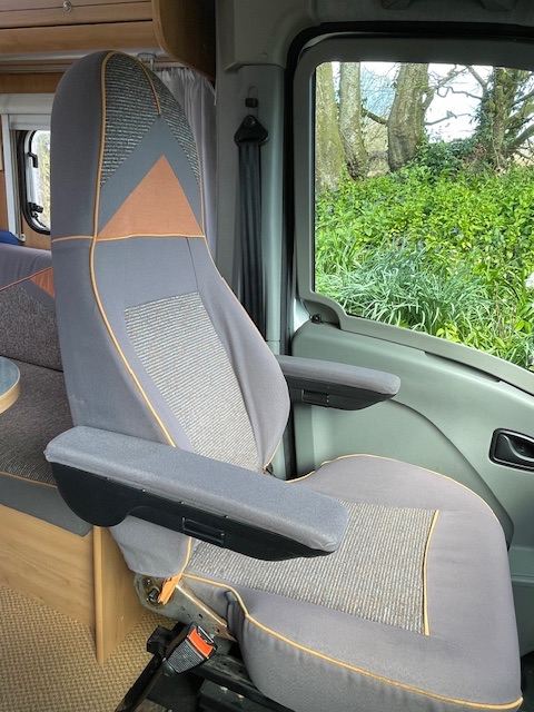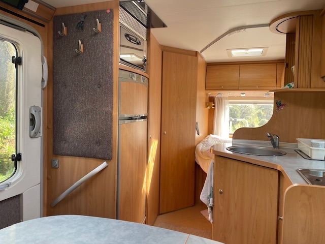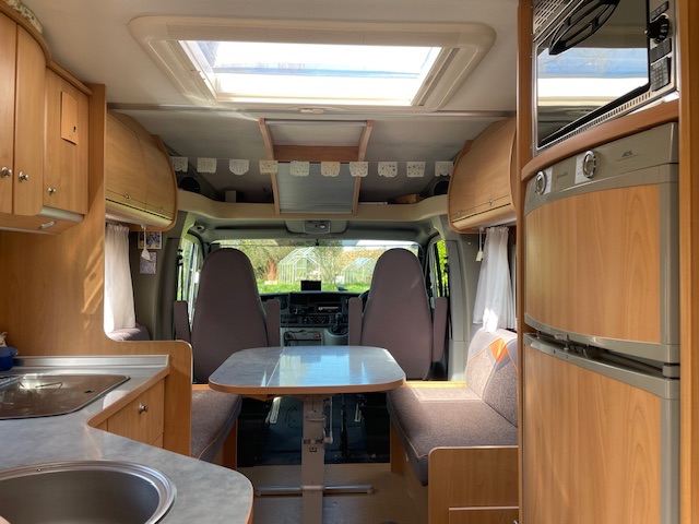 On entering via the driver’s side habitation door you face the main kitchen area with a three burner hob, large sink, good worktop space and plenty of cupboards and drawers. Opposite, to the left of the entrance door is the large fridge, separate freezer and a Smev Oven and grill. In front of the entrance door is a spacious lounge area comprising of two inward facing sofas, twin swivel cab seats and a removable table that has a useful foldaway section to give more lounging room. A TV and arial is included.