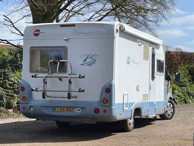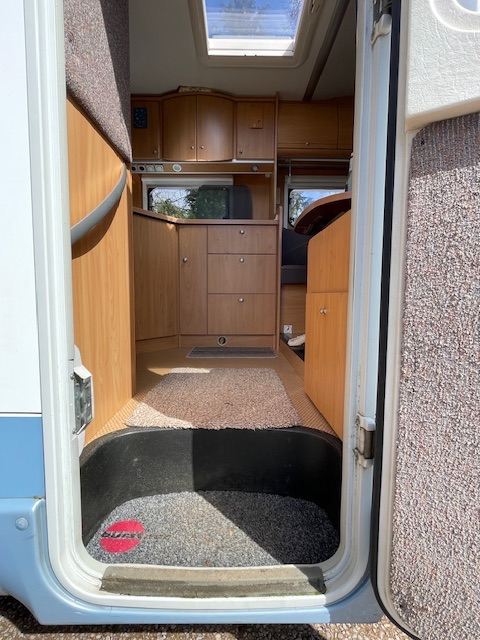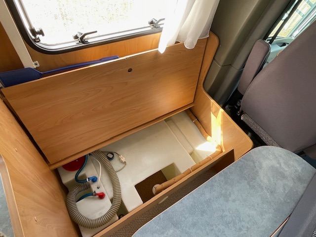 At the rear of the motorhome is a French bed in the nearside corner, with a large accessible storage area underneath. Access to the storage is also possible from the outside. In the other corner is the bathroom with a good sized separate shower, wash hand basin, Thetford swivel bowl toilet and plenty of cupboards. Power for the domestic side of the motorhome is via two 110 Amp batteries. A new engine starter battery has recently been installed. The cab area features air conditioning, a reversing camera and a Radio CD player with 2 speakers. . Loose fit carpets, a mains electric lead and bike rack for 2 bikes are included with this Delfin.