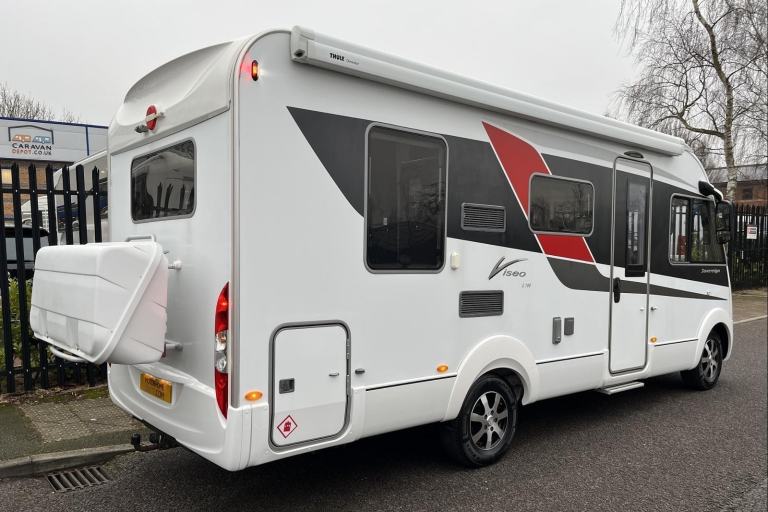 We are very pleased to present superb automatic, A-Class Burstner Viseo i700 Sovereign automatic motorhome, built on the Fiat chassis. German quality build with high specification of extras, and with only 12912 miles. 4-berth/4-belt | Spacious rear lounge with large skylight giving plenty of light and comfort | Well equipped kitchen with gas hob, oven, grill, microwave, fridge freezer, sink, extending worktop and plenty of storage | Comfortable dining area with easily extending table | Swivel driver & passenger seats give additional seating for a relaxing social area | Large washroom with vanity basin, swivel wall creates a separated shower enclosure, wc and plenty of clever storage | Rear double bed easily converts in the lounge | Large double bed folds down above the cab area | Truma combi heating & hot water | Satellite | Zenec GPS navigation, Multi-media & Bluetooth system | Air rear suspension for comfort travelling | Cab air-conditioning | Heated front seats | Reversing camera | Awning | External BBQ point | External TV point | Bike rack frame with storage box & bike fittings | 2 gas bottles | Tow bar | Autowatch alarm system | For additional photos, further information or to arrange a viewing, please contact Julian on [Phone number removed]. Please note, this vehicle is not a brokerage unit and as such means that it is compliant with the Consumer Rights Act 2015.