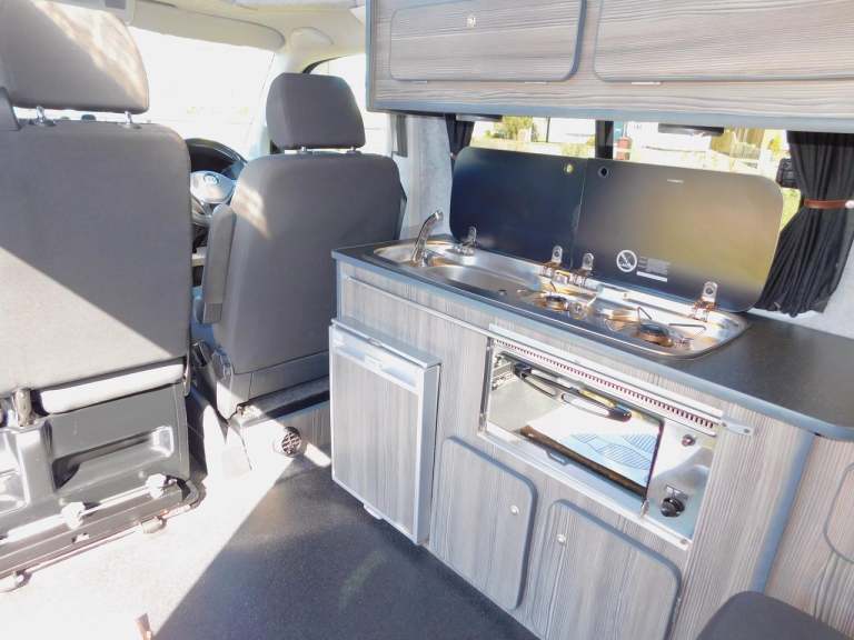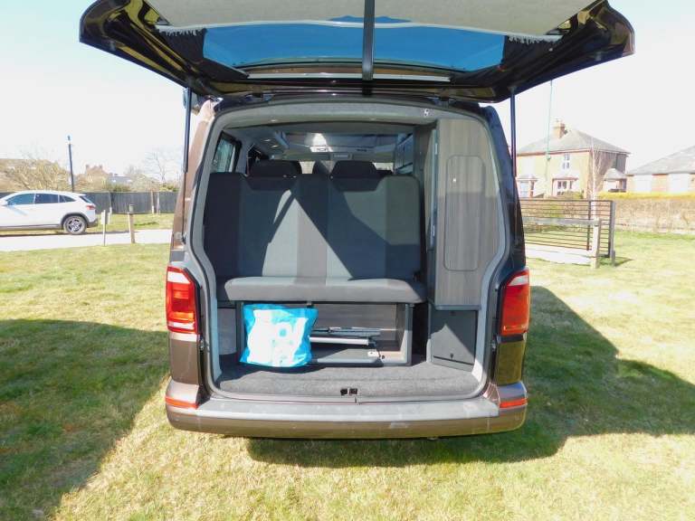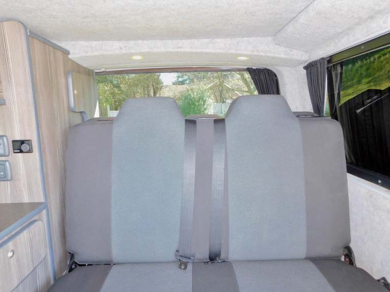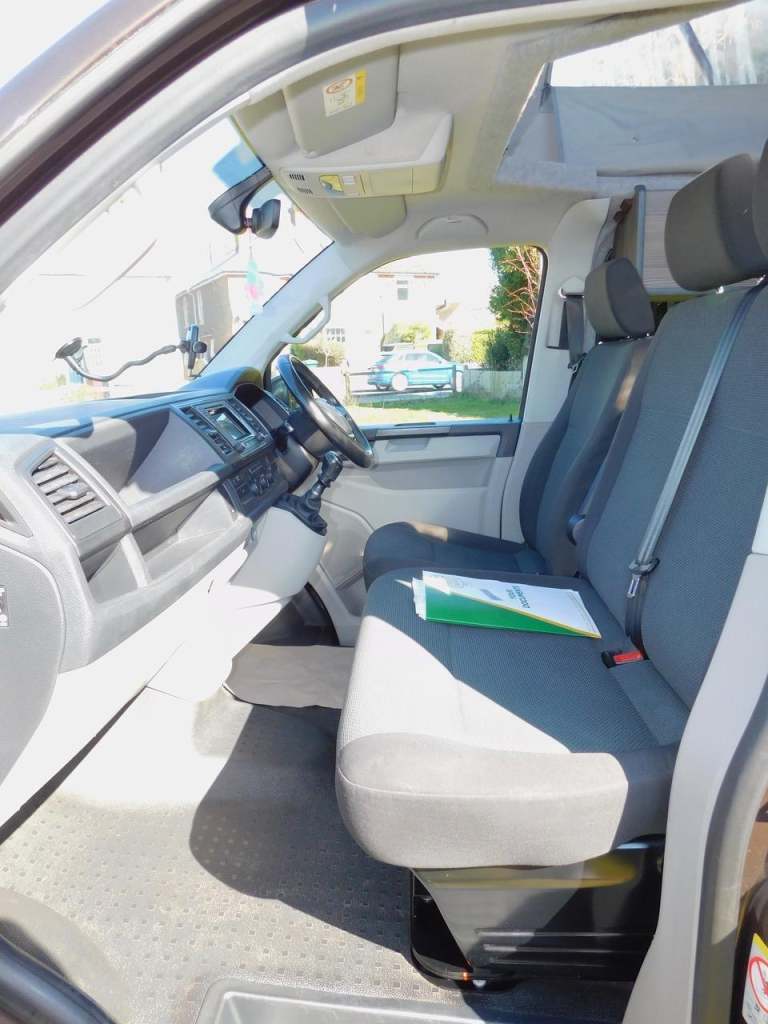 On the Outside we have the Dark Tinted Privacy Glass, Stylish stainless steel Side Bars,Fiamma Wind Out Awning with the Matt Black Finish Cassette, Front and rear Fog Lights, the Colour coded Front and rear Bumpers and VW badge in the Front Grille, Plus Very Smart multi spoke 20 Inch Alloy wheels, plus Reverse Parking Sensors with both audible and visual on screen display….