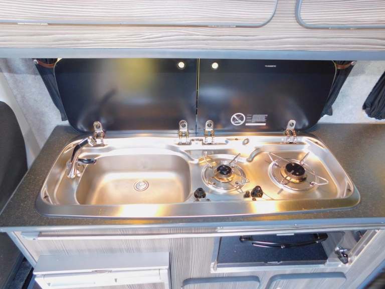 The KITCHEN is comprehensively finished and includes a Dometic 2 Burner Gas Hob and Sink with an Electric Tap, all housed under toughened glass hinged tops, Plus a Waeco Fridge with a little Freezer box for your Ice. There is also a Dometic Gas Grill plus plenty of worktop space. We have Led Lighting throughout.