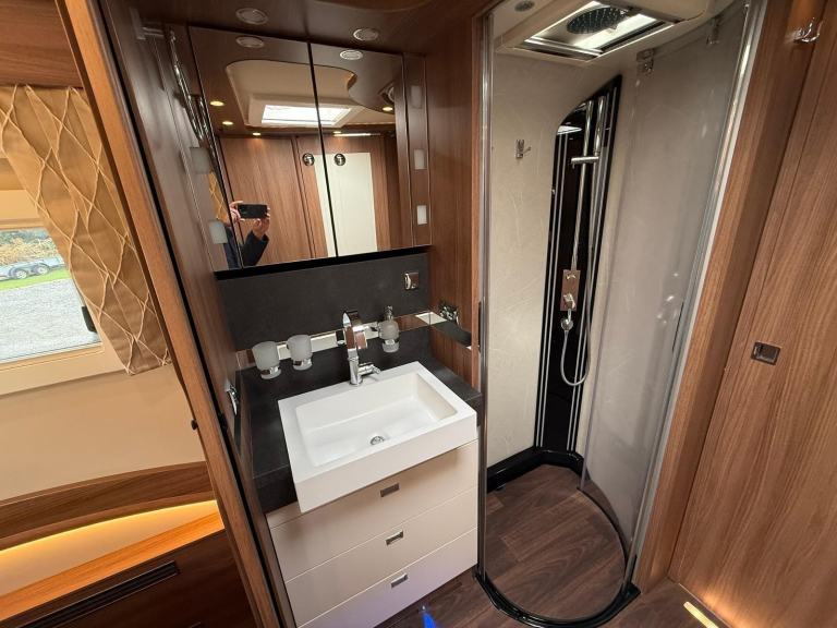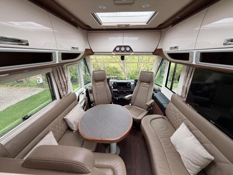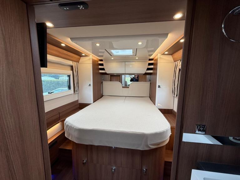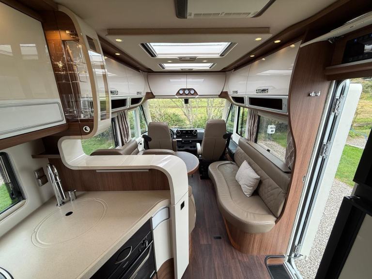 Carthago Chic E Line 64 XL QB MB, High Quallity, Luxury Motorhome in Immaculate Condition. This motorhome is built on the Mercedes chassis with automatic gearbox and 170bhp engine with full service and Habitation history. It is built to the hightest standards with a beautifully designed interior and has many additional useful features. At the rear is the bedroom with island bed and under this is a large garage. Next to this is the bathroom with separate shower compartment. In the centre there is a well equipped kitchen and at the front there is a spacious lounge with plenty of seating options. It comes with Cab and Habitation Air Con, Cruise Control, Rear Camera, DAB Radio, 2 x TVs, Satellite System, 2 x Solar Panels, 2 x Lithium Batteries, Auto Self Leveling, Gas Low System, Tracking, Inverter, Wi Fi, Outside Shower and BBQ Point. A truly stunning luxury motorhome available for viewing by appointment. Call for more photos, videos and full spec sheet.