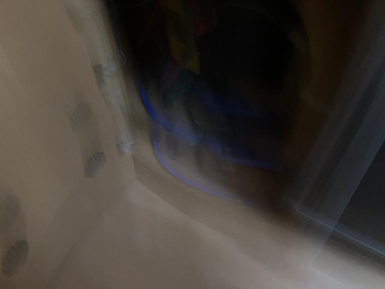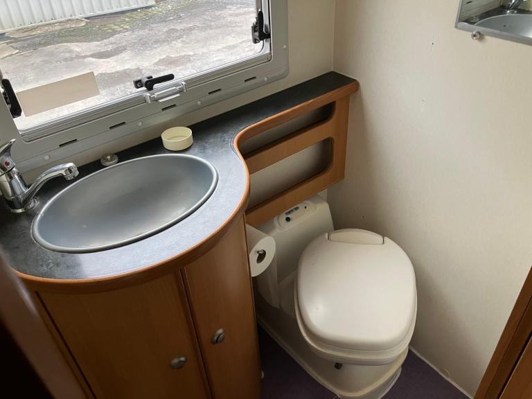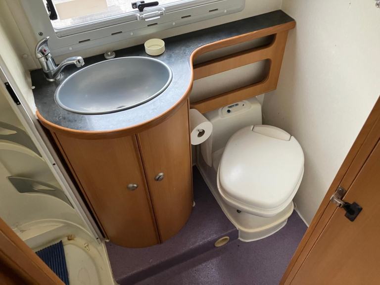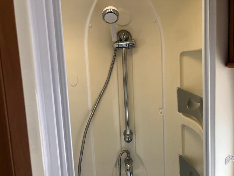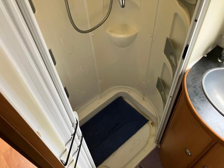 The washroom has shower, Thetford cassette toilet, wash basin and tap and storage
