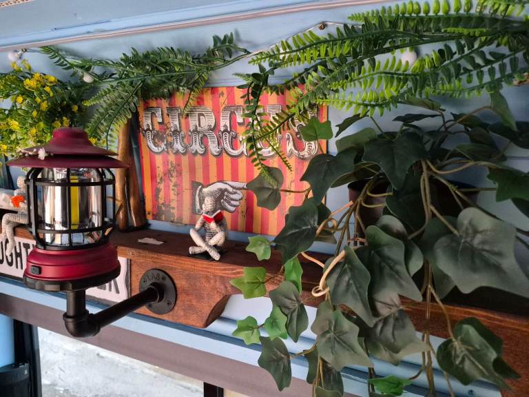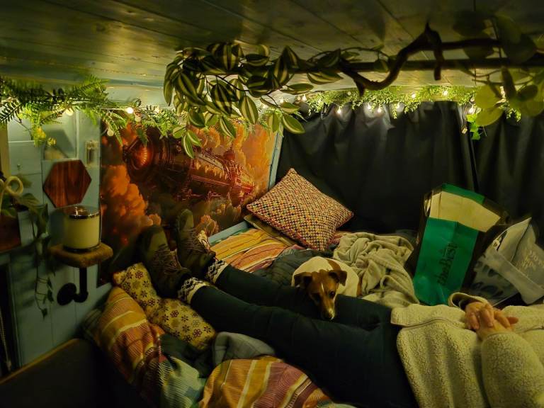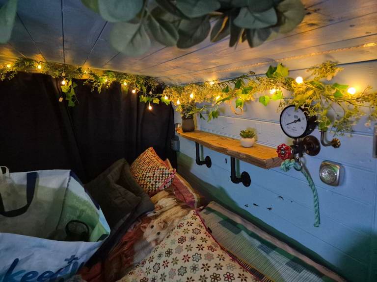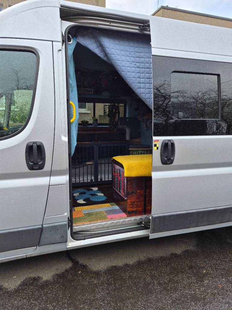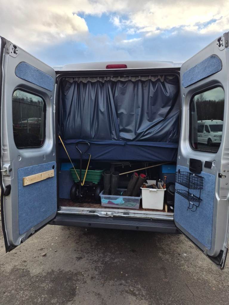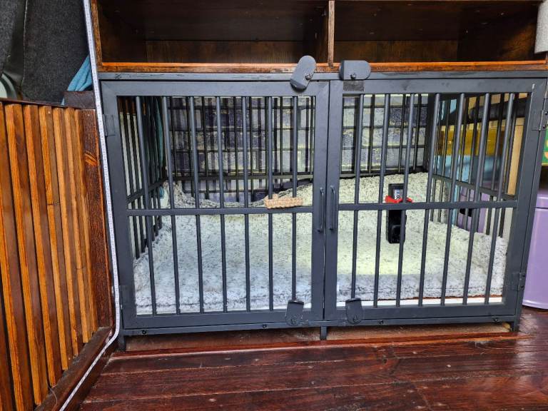 there is no electrics in the back, so that nothing drains battery i used it mostly for days out etc there is a full size double bed built on an IKEA frame,and plenty of room for 2 adults sleeping . Electrics can be added if thats your thing, i just used a spare battery also portaloo space provided and lovely dog bed furniture cage.
