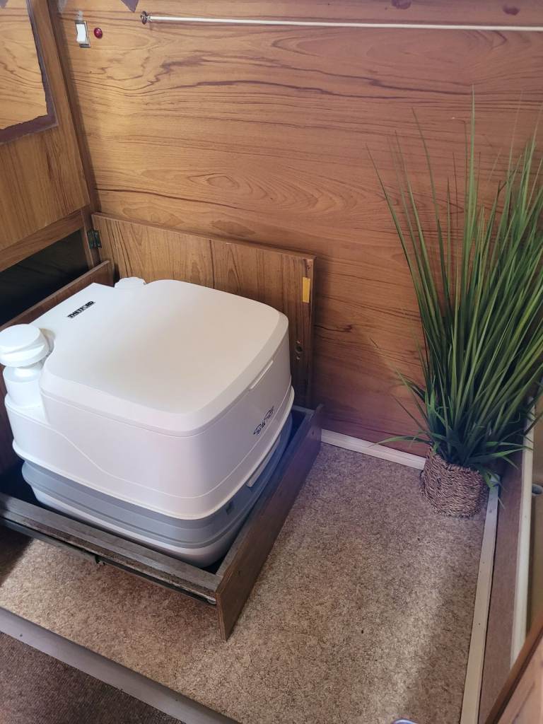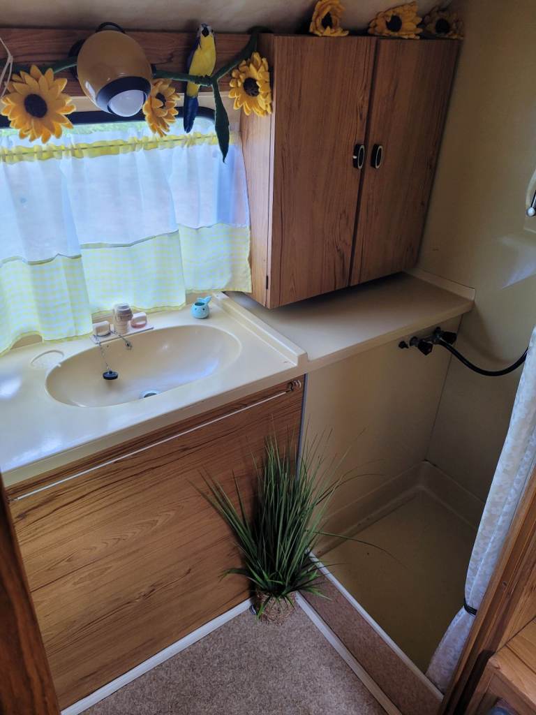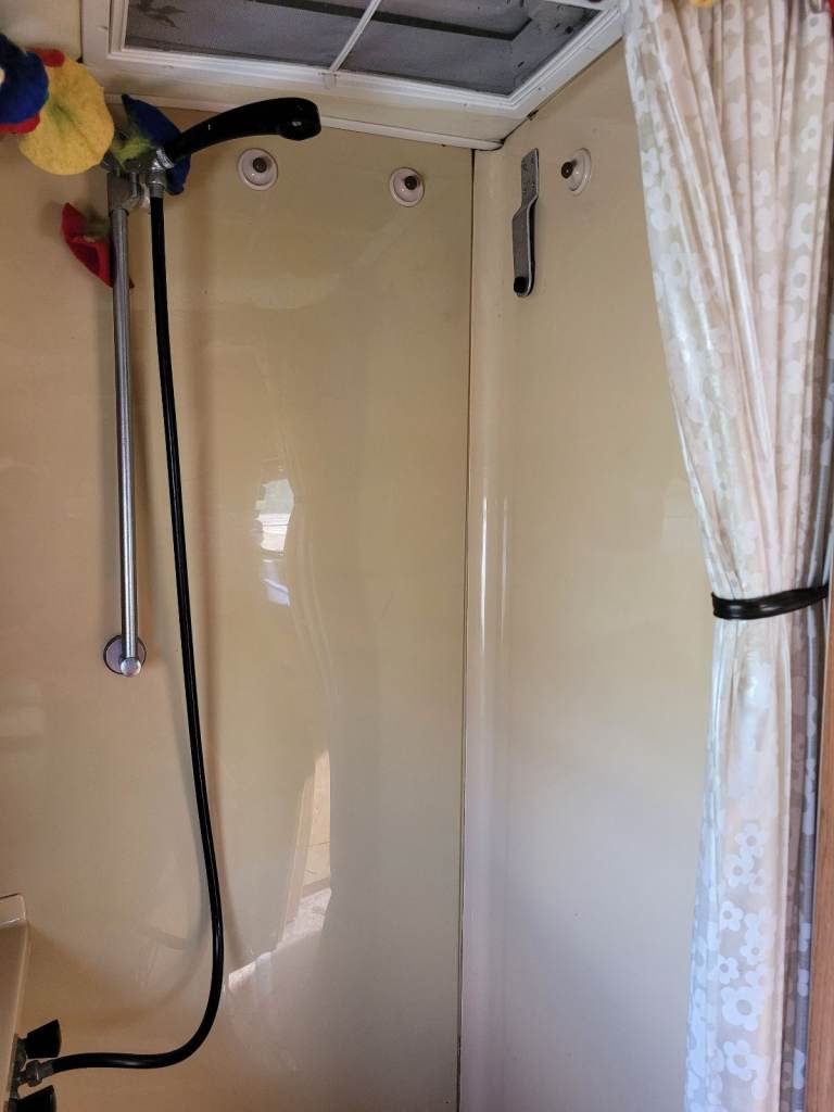 Separate shower room incorporating 12v retro lighting, wardrobe, wash basin, sliding tray for chemical loo and a shower cubicle complete with the original shower curtain!