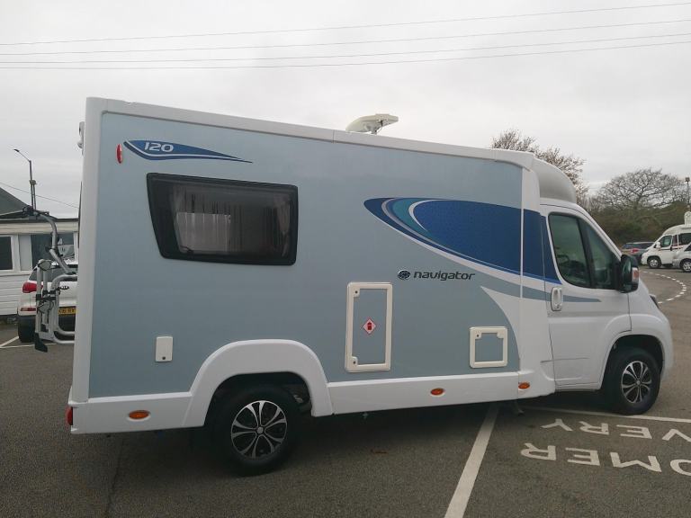 This 2 berth Compass Navigator 120 is based on the 2.2td Peugeot chassis. The layout consists of an end lounge which offers 2x single beds or a double, side kitchen, bathroom and wardrobe opposite, swivel cab seats. The spec consists of heating, hot water, ovenb/grill, 3 burner hob, 3 way fridge, water tanks, microwave, awning, TV aerial, bike rack, rev camera, satnav, bluetooth, cruise control and cab A/C, alloys, BBQ point., Features Include: air conditioning, bluetooth connection, colour satnav, external gas bbq point, panoramic sunroof, usb/ipod interface, hand basin, shower, wardrobe, 3-burner hob, 3-way fridge, grill, hob, kitchen, oven, side kitchen, sink/drainer, 3 point seatbelts, central locking, electric windows, park assist camera, power steering, cruise control, power steering, trip computer, abs, air bag, passenger airbag, immobiliser, alloy wheels, colour coded body, 3 way fridge, alloys, awning, battery charger, bbq point, bike rack, bluetooth hands free, cab air con, cassette toilet, cruise control, fresh water tank, fridge, grill, heater, hob, hot water, leisure battery, mains hookup, microwave, oven, passenger air bag, reversing camera, toilet and shower, tom tom sat nav, tv aerial, under 3500kg, usb points